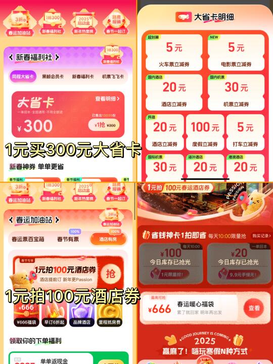 2、1元省钱卡:1元买300元组合优惠券包(里面有5元火车票立减券+20元酒店立减券+30元机票立减券+5元景区立减券等),全国通用,一单就回本,不用是可以全额退的,很划算