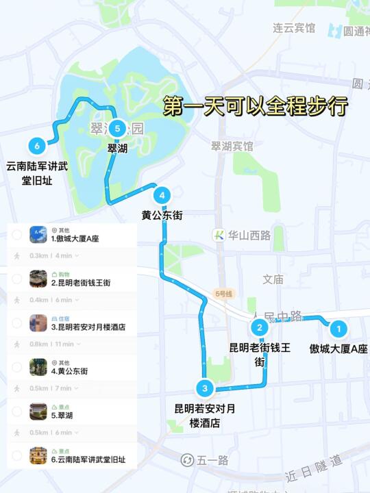 Day1:昆明老街→对月楼[搜索高亮]→傲城大厦→黄公东街→翠湖公园→云南陆军讲武学校→官渡古镇