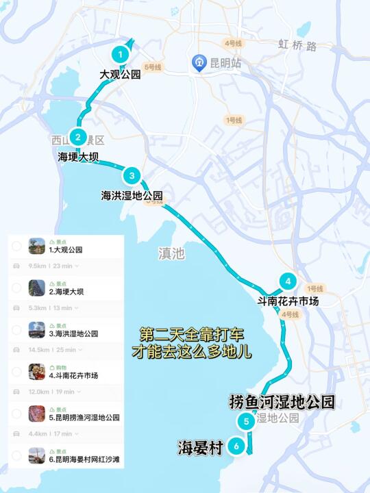 Day2:大观公园→海埂大坝→海洪湿地公园→海晏村→捞鱼河湿地公园→斗南花市