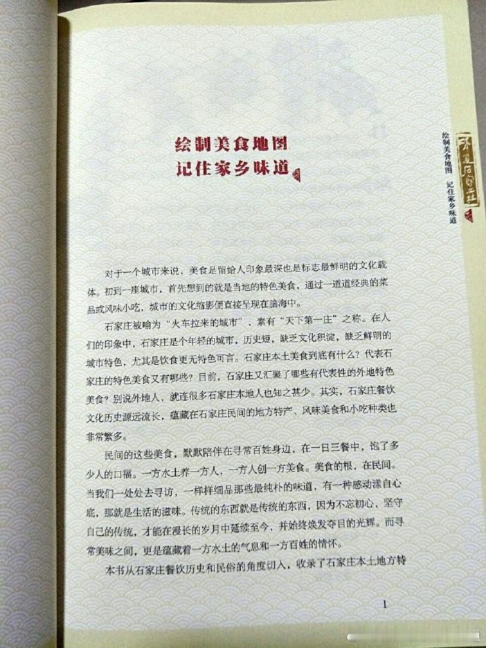 【《味道石家庄》出版发行,一本精彩的石家庄美食地图】对于一个城市来说,美食是留给人印象最深也是标志最鲜明的文化载体。石家庄本土美 食到底有什么?代表石家庄的特色美食有哪些?目前,石家庄又汇聚了哪些有代表性的外地特色美食?《味道石家庄》将给大家呈现一幅基本完整 的石家庄“美食地图”。 石家庄生活