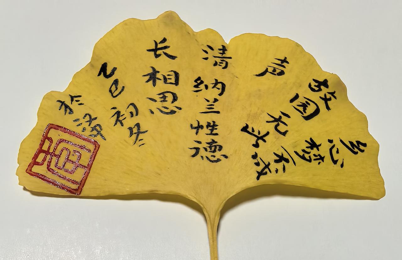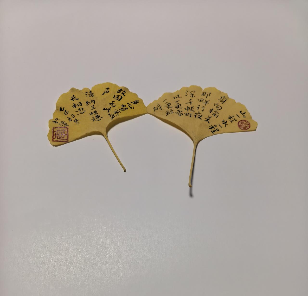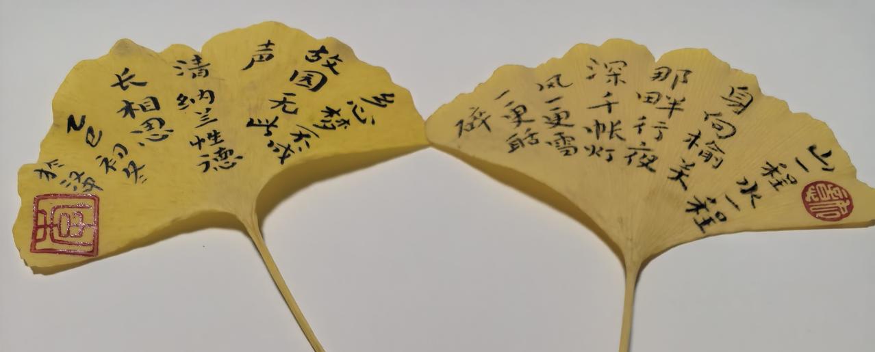 初冬季节,又是银杏叶子在路面,扑满金黄的时候,刚刚掉下的叶子还很干净,我就捡拾了些许,在银杏叶子上写写诗词,就当做书签吧!