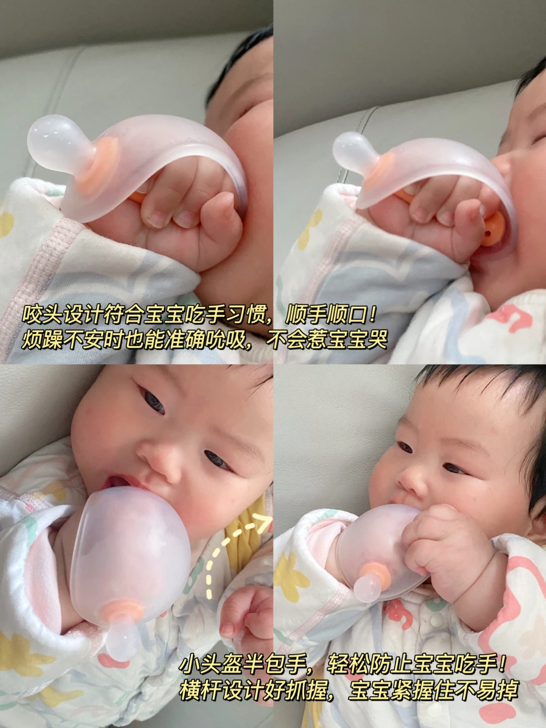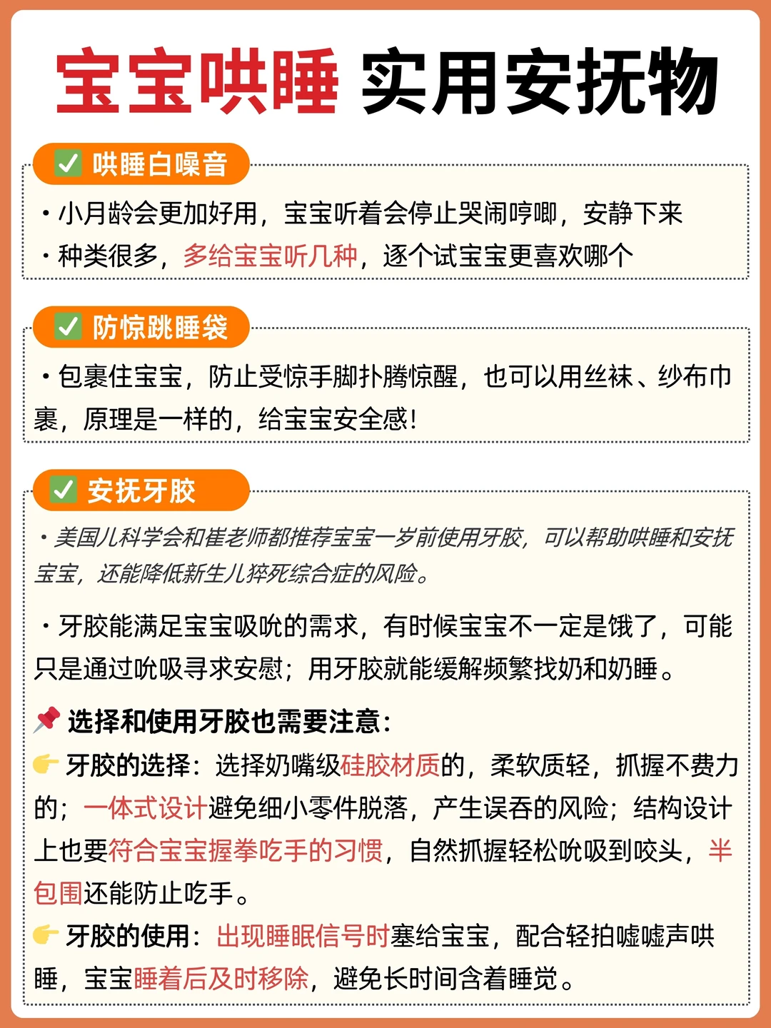 尤其对于吮吸成瘾的宝宝,可以使用安抚牙胶。有时候宝宝不一定是饿了,可能只是通过吮吸寻求安慰;用牙胶就能缓解频繁找奶和奶睡。美国儿科学会和崔老师都推荐使用牙胶哄睡和安抚宝宝。