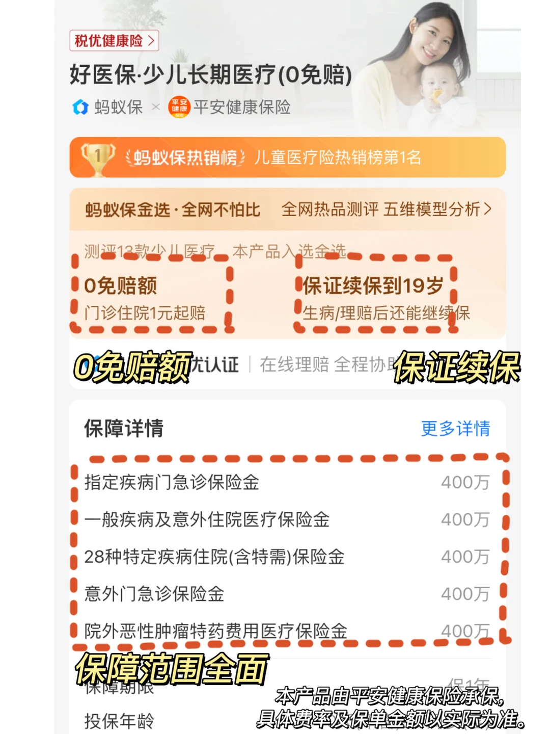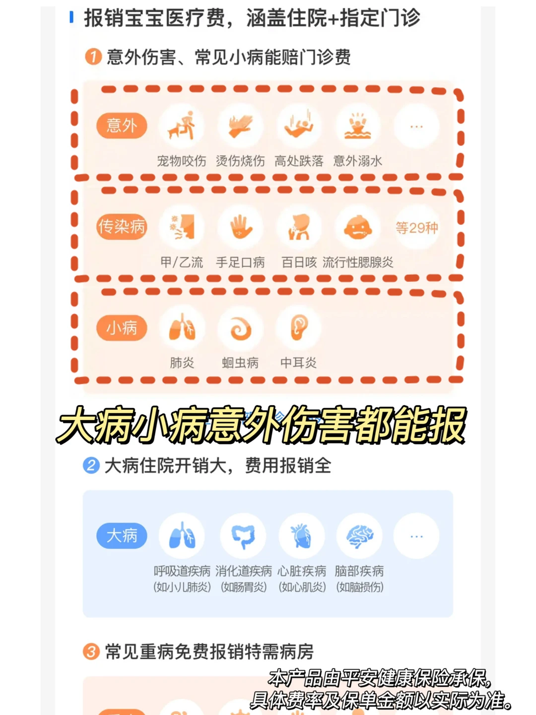 就是说赔付无门槛,哪怕自费1块钱都可以纳入报销范围,真正覆盖到日常小病的报销。意外伤害32种常见病门急诊、住院按照80%比例报销。儿童高发的28种重疾按照100%比例报销,宝宝日常也能用的上,大病也能有保障