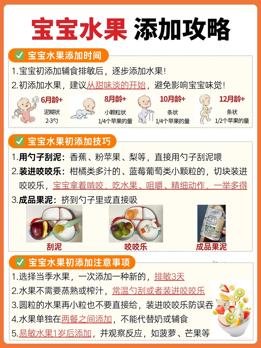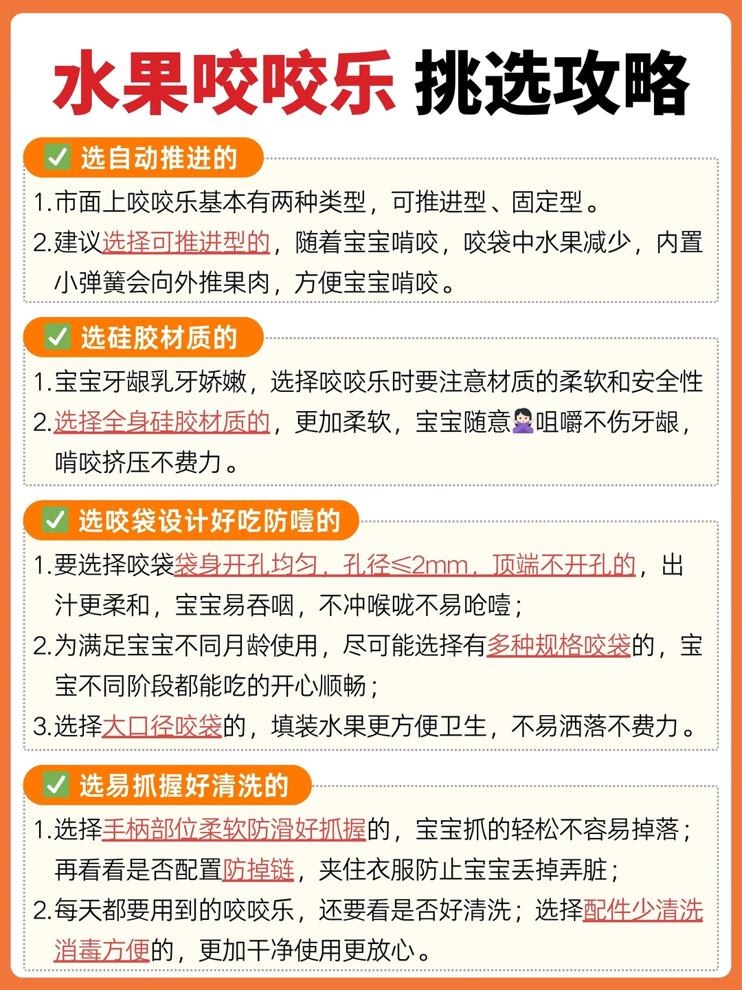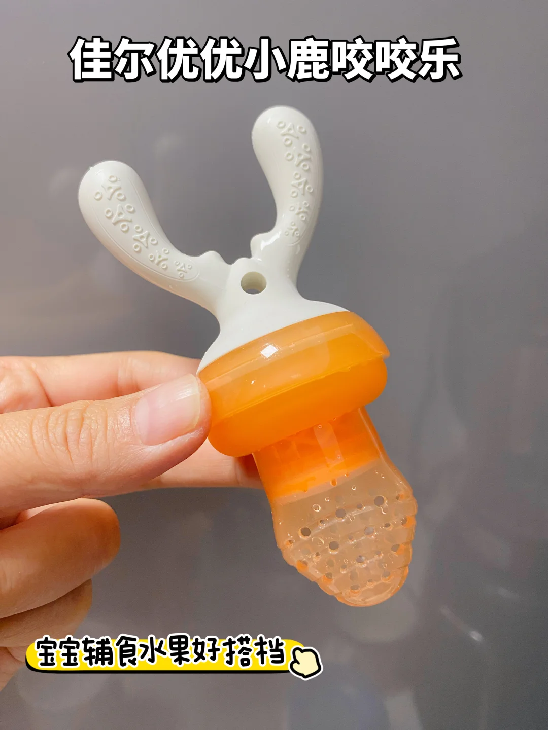 很多新手妈妈都在头疼宝宝辅食添加的问题,一些宝宝在辅食添加初期会出现抗拒,仔细了解,才发现很多都是辅食添加不当造成的😭 · 橙妈整理了常见的辅食添加9个误区,看看你家有没有踩坑? ❌ 误区一:必须6月龄第1天添加辅食 ❌ 误区二:照抄网上的辅食表 ❌ 误区三:米油或粥替代高铁米粉 ❌ 误区四:蔬菜添加从根茎类开始 ❌ 误区五:鸡蛋白1岁以后添加 ❌ 误区六:肉类10个月以后才添加 ❌ 误区七:一直吃糊状细腻好吞咽 ❌ 误区八:不吃盐宝宝没有力气 ❌ 误区九:水果打成果汁加进米糊 👉 具体原因和正确做法看图P1-2! · 🍚养了两个宝宝,橙妈真的觉得辅食添加是一件轻松,自然而然的事情,总结了辅食添加的8个第一口,一张图就能说明白,姐妹们看图3! 👩🏻最近很多宝妈问到, 宝宝水果应该怎么添加❓ 水果榨成汁喝行不行❓ 水果要不要加热煮熟❓ 水果加进米糊会不会宝宝更爱吃❓ 宝宝水果到底应该怎么吃❓ 🍌橙妈就给大家来分享一下,从《中国居民膳食指南》《美国儿科学会育儿大百科》以及崔玉涛老师那里学来的水果添加攻略! 🍎宝宝添加辅食半个月后就可以添加水果啦!通常选择温和、甜度适中的水果,比如香蕉、粉苹果,用刮泥勺直接刮泥,在吃完辅食1小时左右,尝几口就行了!需要提醒的是,每次新添加1种食材,注意排敏! 🫐对于像柑橘类、葡萄、蓝莓这种Q软多汁,以及小的圆粒状的水果,通常可以切块后塞进咬咬乐让宝宝自己拿着啃咬。既尝试了更多食材,又锻炼了咀嚼啃咬能力,同时手眼协调精细动作也得到了锻炼,好处多多! 🍇我家宝宝添加水果时也用了好几个咬咬乐,最近发现佳尔优优家新出了这款小鹿咬咬乐,全身硅胶材质轻软Q弹,宝宝很喜欢。咬咬乐带了两个大小不同的咬袋,适合不同月龄阶段的宝宝。大口径设计,塞装水果很方便,不会掉出来,咬袋袋身开孔均匀细腻,2mm孔径大小合适,既能方便吃到水果,大力啃咬时也不会爆出来冲喉咙,很温和。自带硅胶小弹簧,自动推进果肉,不会浪费。 🦌鹿角造型的手柄柔软防滑好抓握,还预留了防掉链穿孔,送防掉链,真的很懂宝宝的习惯。清洗也很方便,直接清水冲洗就干净了,全身高温蒸煮消毒,使用起来很安心。
