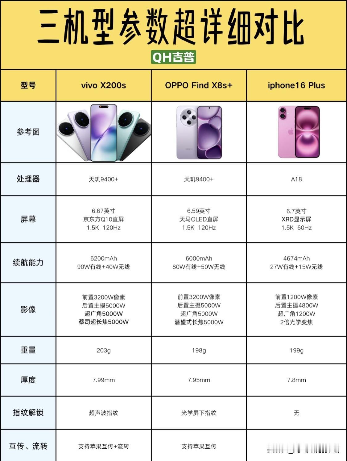 🎉vivo X200s、O泡 Find X8s+、果16 Plus,这哥仨都是热门的果味机,用户群体没有特别大的区别。那么他们配置和价格有什么区别呢