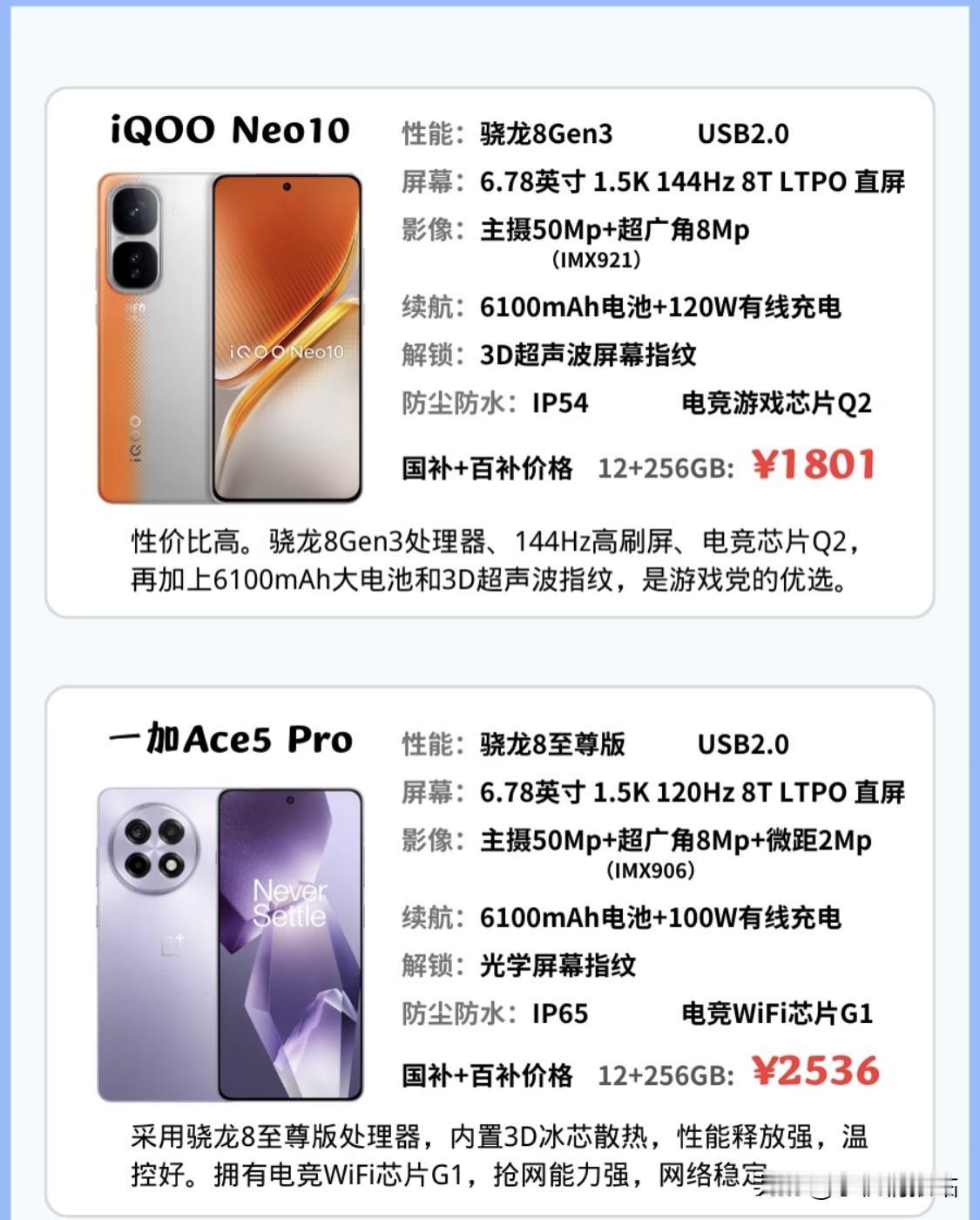 iQOO Neo10发布时性价比就很高,骁龙8Gen3处理器、144Hz高刷屏、电竞芯片Q2,再加上6100mAh大电池和3D超声波指纹,是游戏党的优选。