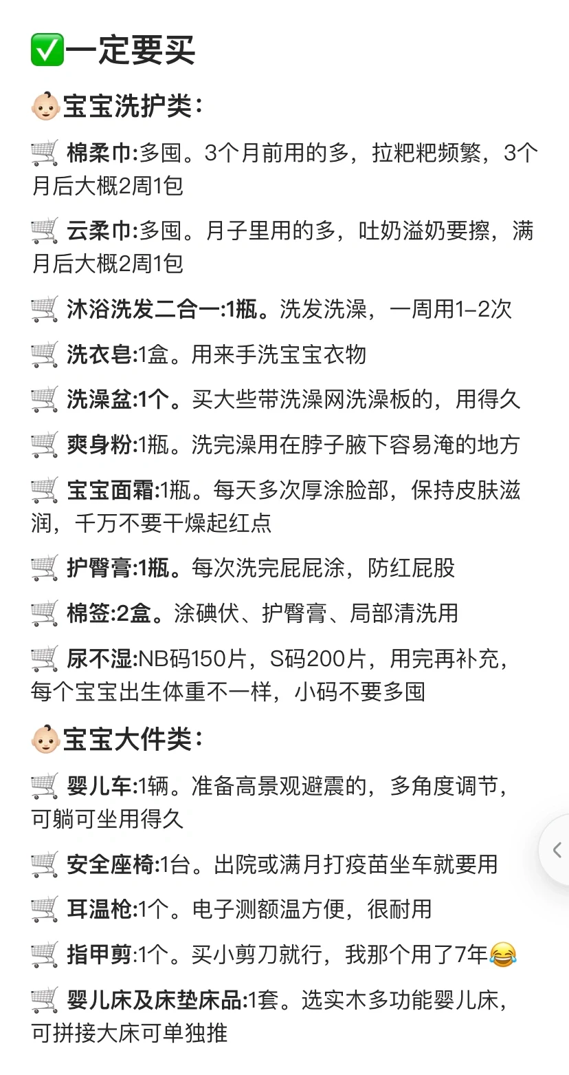 安全座椅、多功能婴儿床、婴儿车、耳温枪、奶瓶、温奶器、奶瓶刷、纯棉连体衣、胎帽、袜子、包被、纱布浴巾、小方巾、浴盆、指甲剪、尿不湿、棉柔巾、云柔巾、隔尿垫、保湿霜、屁屁霜、洗护二合一、润体乳、小棉签