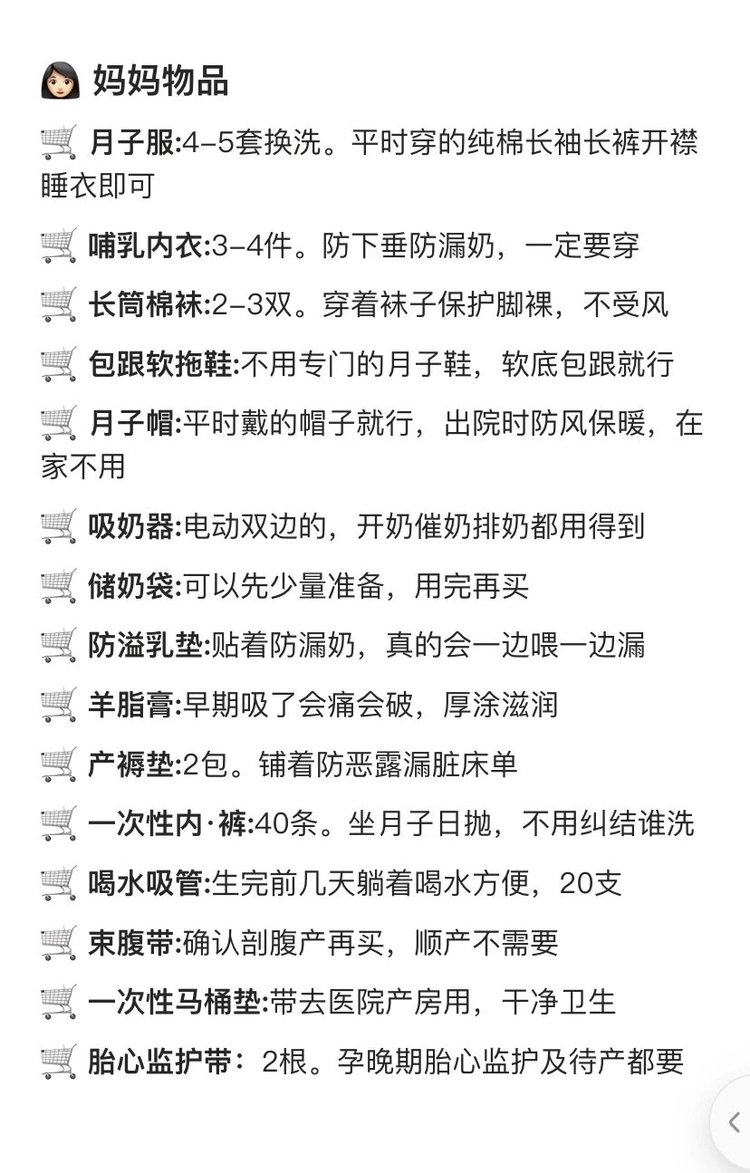哺乳内衣、长筒棉袜、包跟软拖鞋、电动吸奶器、储奶袋、防溢乳垫、羊脂膏、产褥垫、一次性裤裤、喝水吸管、一次性马桶垫、胎心监护带、加长卫生巾