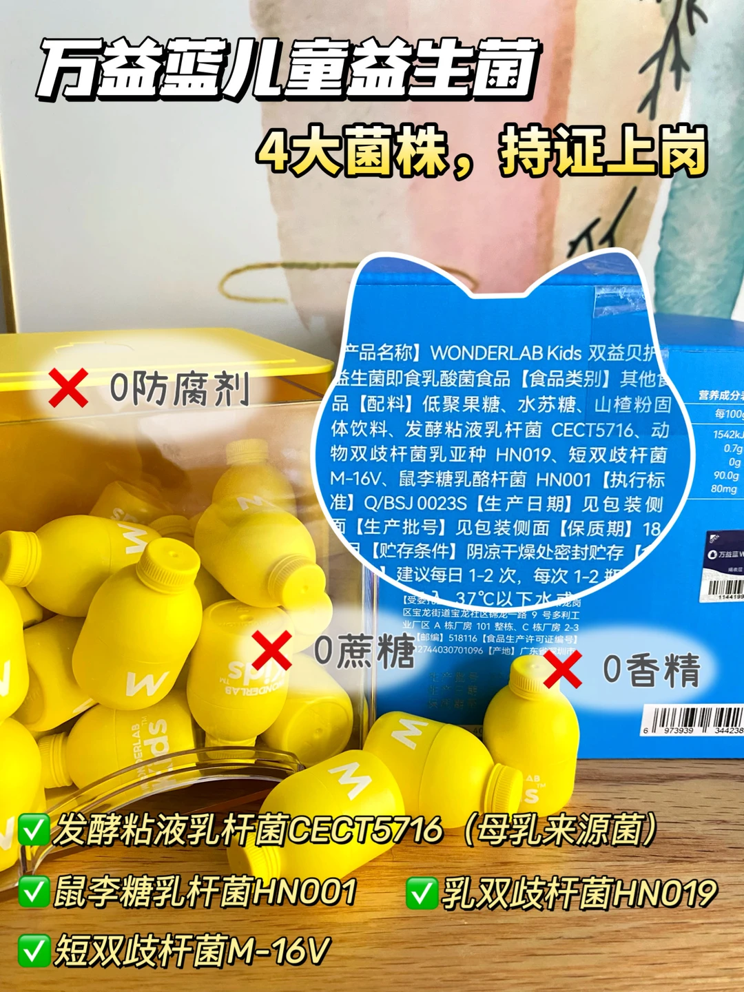 给宝宝换过多款益生菌,后来我家持续回购的是万益蓝小黄瓶益生菌。4种菌株均在卫健委《可用于婴幼儿食品的菌种名单》上,并且包含非常珍贵的母乳菌-发酵黏液乳杆菌CECT5716,它是从健康母乳中分离出来的有益菌。
