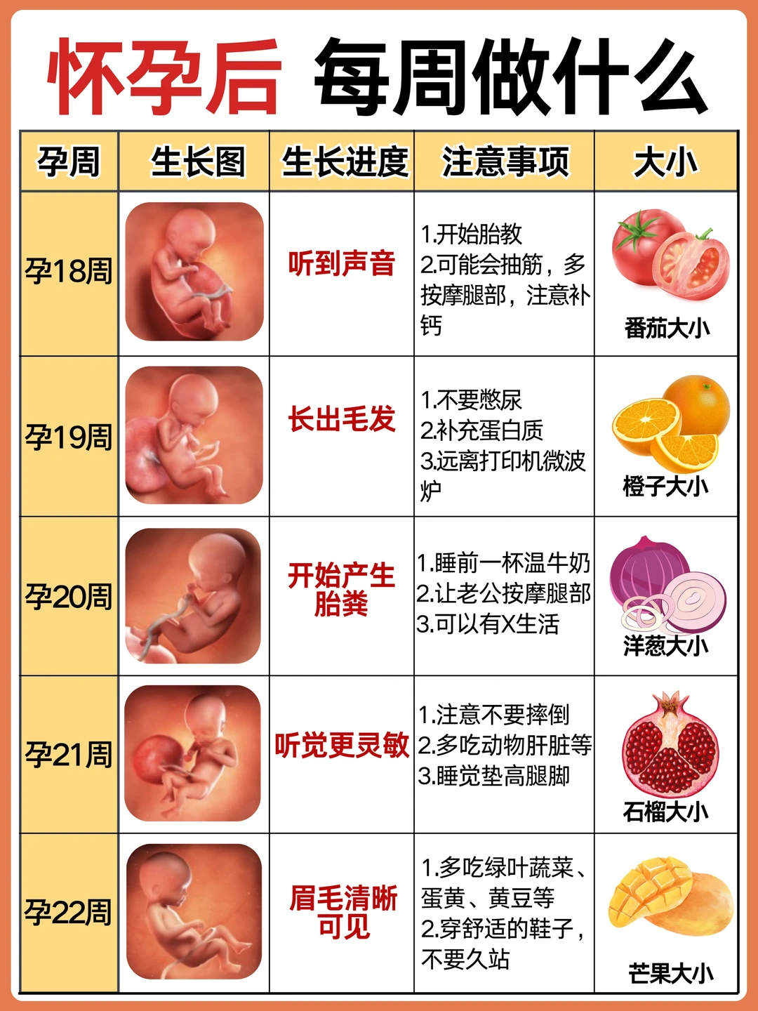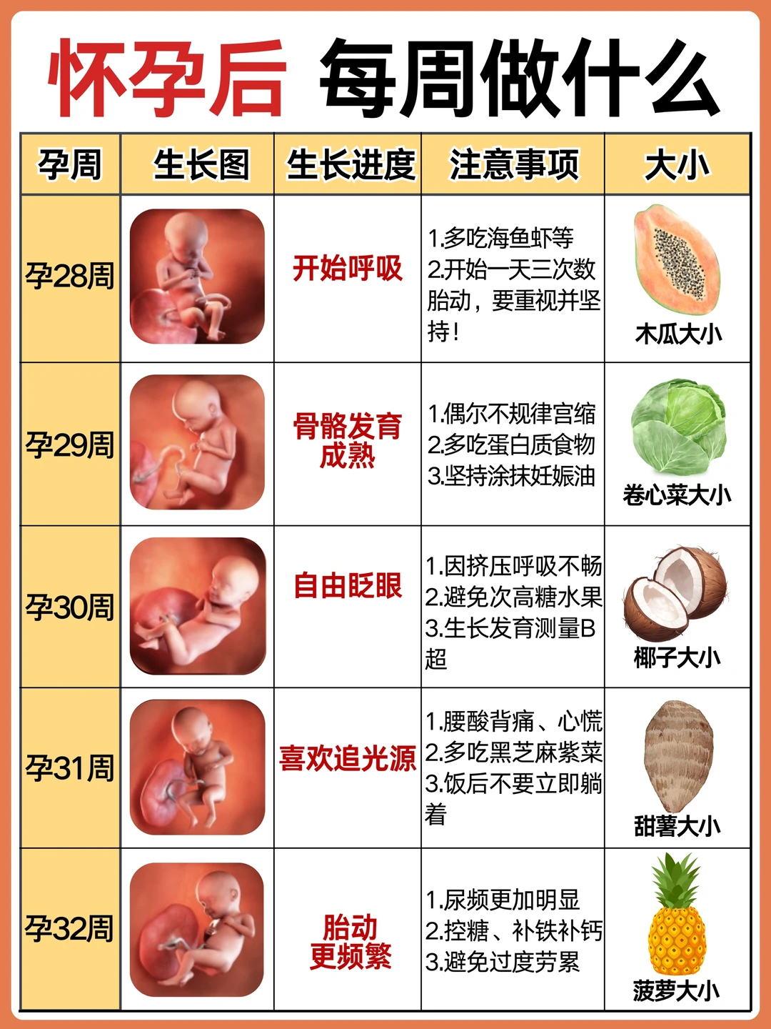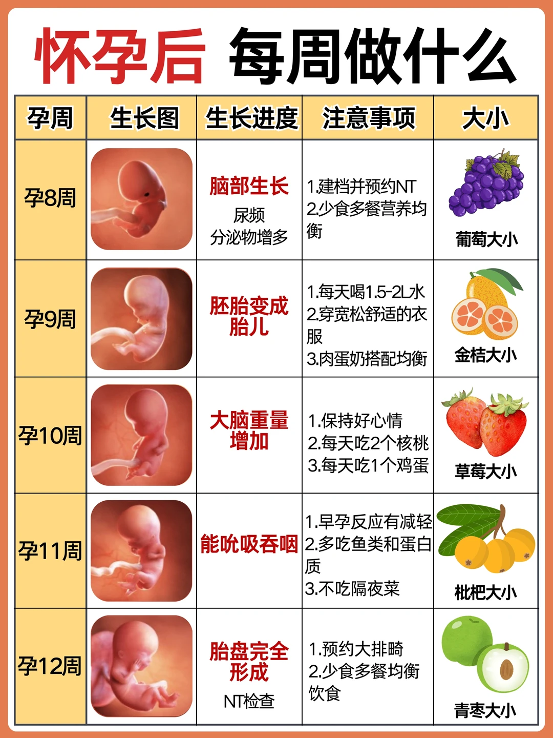 不懂就问有问必答 作为二胎妈妈,给孕期的姐妹整理了怀孕后每周要做的事情,产检以及注意事项! 怀孕后准妈妈会面临身体、心理上的不适,作为准爸爸也要积极学习孕产知识,帮准妈妈分担,让准妈妈保持好心情! · 👉 孕期不同阶段产检: 1️⃣6-8周:HCG、B超确认怀孕 2⃣️12周之前:NT、建小卡,可以预约三维或四维了 3⃣️12-18周:唐筛或无创或羊穿 4⃣️20-24周:建大卡,糖耐、心超、系统检查 5⃣️22-26周:大排畸也就是三维或四维 6⃣30-32周:小排畸(生长发育测量) 7⃣34-40周:常规胎心监护等 8⃣35-37周:B族链球菌 9⃣36-分娩:胎心监护,孕期小结 注意: 1.刚测出两道杠去确认,挂妇科 2.每次去产检问清楚下次的时间和项目以及注意事项,是否要空腹等 3.遇到热门的号,难抢的,这次产检完可以问问大白能不能帮忙预约下次的 4.按照时间集中产检项目,尽可能少跑一次,比如做无创时约好三维,做三维时建大卡开好糖耐心超等 5.去产检前记录好最近遇到的状况,要问的问题,一起问 · 👉 怀孕后需注意: ❤️ 发现怀孕后: 补充:叶酸,每天400单位 日常饮食:少食多餐,补充蛋白质、碳水和纤维素 ❤️ 怀孕第2个月: 补充:叶酸,维生素B6,维生素C 日常饮食:多吃开胃食物,补充水果及维生素 ❤️ 怀孕第3个月: 补充:叶酸,镁,维生素A 日常饮食:多吃高膳食纤维食物、补充足够水分 ❤️ 怀孕第4个月: 补充:维生素D3和钙,DHA 日常饮食:少食多餐,注意摄入多种营养元素 ❤️ 怀孕第5个月: 补充:钙,DHA,铁 日常饮食:多吃富含DHA的深海鱼类,牛奶豆制品等补钙 ❤️ 怀孕第6个月: 补充:铁+VC,钙+VD 日常饮食:补充蛋白质,多吃鸡蛋、豆类、红肉等 ❤️ 怀孕第7个月: 补充:DHA,VA,VC 日常饮食:持续补充蛋白质,适当补充卵磷脂 ❤️ 怀孕第8个月: 补充:蛋白质,铁 日常饮食:吃富含蛋白质的食物 ❤️ 怀孕第9个月: 补充:蛋白质,膳食纤维 日常饮食:合理饮食 ❤️ 怀孕第10个月: 补充:维生素B1 日常饮食:减少碳水和脂肪的摄入