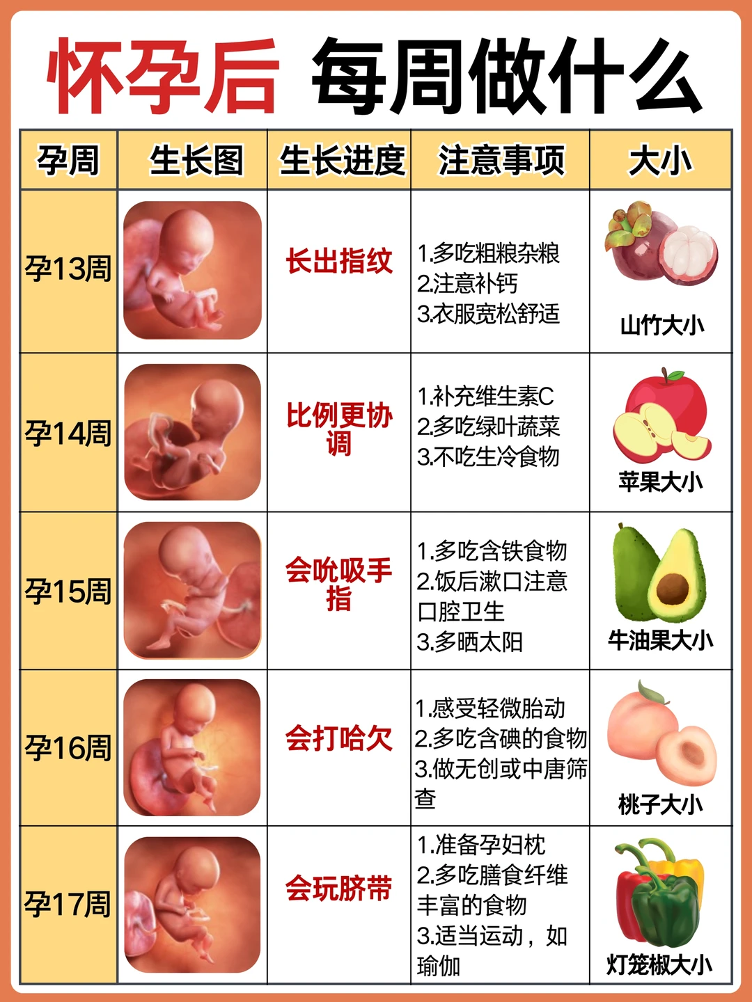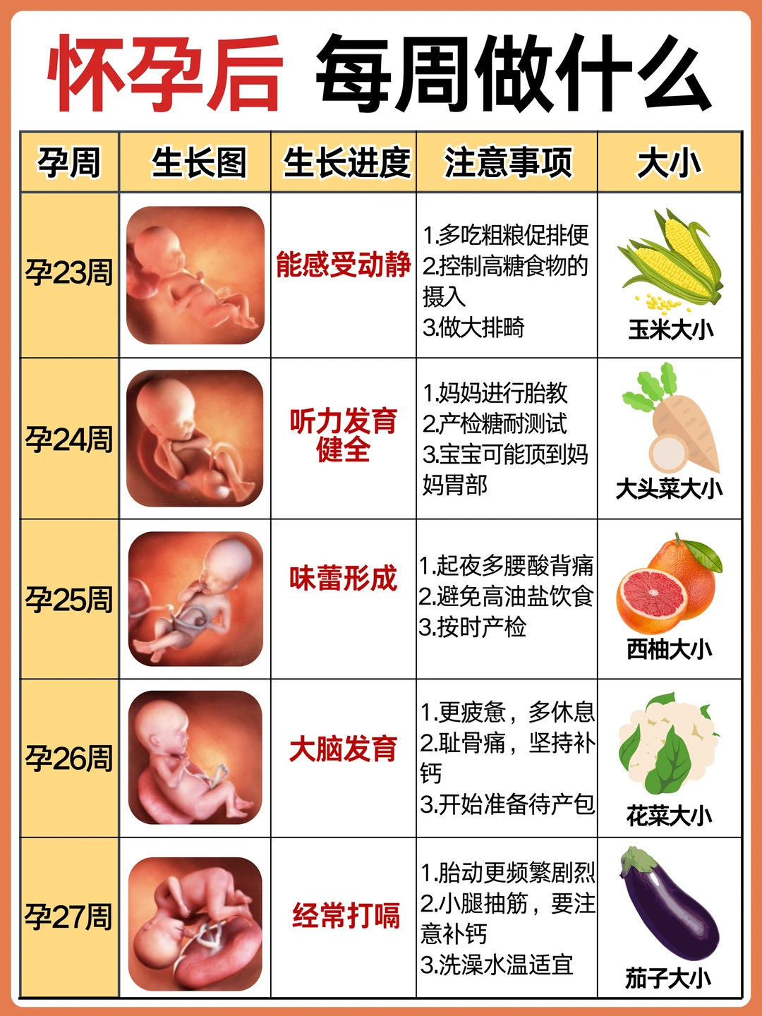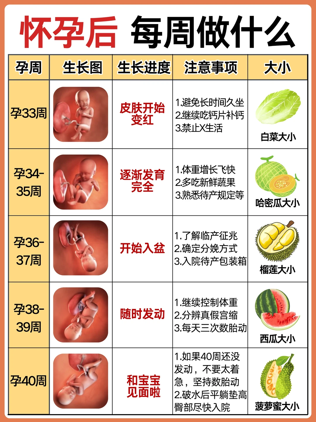 不懂就问有问必答 作为二胎妈妈,给孕期的姐妹整理了怀孕后每周要做的事情,产检以及注意事项! 怀孕后准妈妈会面临身体、心理上的不适,作为准爸爸也要积极学习孕产知识,帮准妈妈分担,让准妈妈保持好心情! · 👉 孕期不同阶段产检: 1️⃣6-8周:HCG、B超确认怀孕 2⃣️12周之前:NT、建小卡,可以预约三维或四维了 3⃣️12-18周:唐筛或无创或羊穿 4⃣️20-24周:建大卡,糖耐、心超、系统检查 5⃣️22-26周:大排畸也就是三维或四维 6⃣30-32周:小排畸(生长发育测量) 7⃣34-40周:常规胎心监护等 8⃣35-37周:B族链球菌 9⃣36-分娩:胎心监护,孕期小结 注意: 1.刚测出两道杠去确认,挂妇科 2.每次去产检问清楚下次的时间和项目以及注意事项,是否要空腹等 3.遇到热门的号,难抢的,这次产检完可以问问大白能不能帮忙预约下次的 4.按照时间集中产检项目,尽可能少跑一次,比如做无创时约好三维,做三维时建大卡开好糖耐心超等 5.去产检前记录好最近遇到的状况,要问的问题,一起问 · 👉 怀孕后需注意: ❤️ 发现怀孕后: 补充:叶酸,每天400单位 日常饮食:少食多餐,补充蛋白质、碳水和纤维素 ❤️ 怀孕第2个月: 补充:叶酸,维生素B6,维生素C 日常饮食:多吃开胃食物,补充水果及维生素 ❤️ 怀孕第3个月: 补充:叶酸,镁,维生素A 日常饮食:多吃高膳食纤维食物、补充足够水分 ❤️ 怀孕第4个月: 补充:维生素D3和钙,DHA 日常饮食:少食多餐,注意摄入多种营养元素 ❤️ 怀孕第5个月: 补充:钙,DHA,铁 日常饮食:多吃富含DHA的深海鱼类,牛奶豆制品等补钙 ❤️ 怀孕第6个月: 补充:铁+VC,钙+VD 日常饮食:补充蛋白质,多吃鸡蛋、豆类、红肉等 ❤️ 怀孕第7个月: 补充:DHA,VA,VC 日常饮食:持续补充蛋白质,适当补充卵磷脂 ❤️ 怀孕第8个月: 补充:蛋白质,铁 日常饮食:吃富含蛋白质的食物 ❤️ 怀孕第9个月: 补充:蛋白质,膳食纤维 日常饮食:合理饮食 ❤️ 怀孕第10个月: 补充:维生素B1 日常饮食:减少碳水和脂肪的摄入