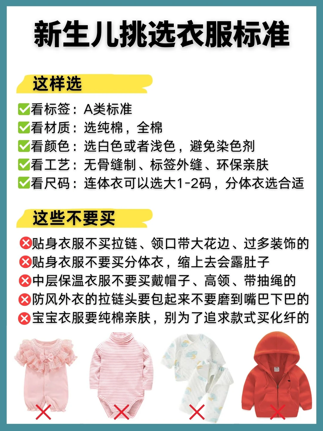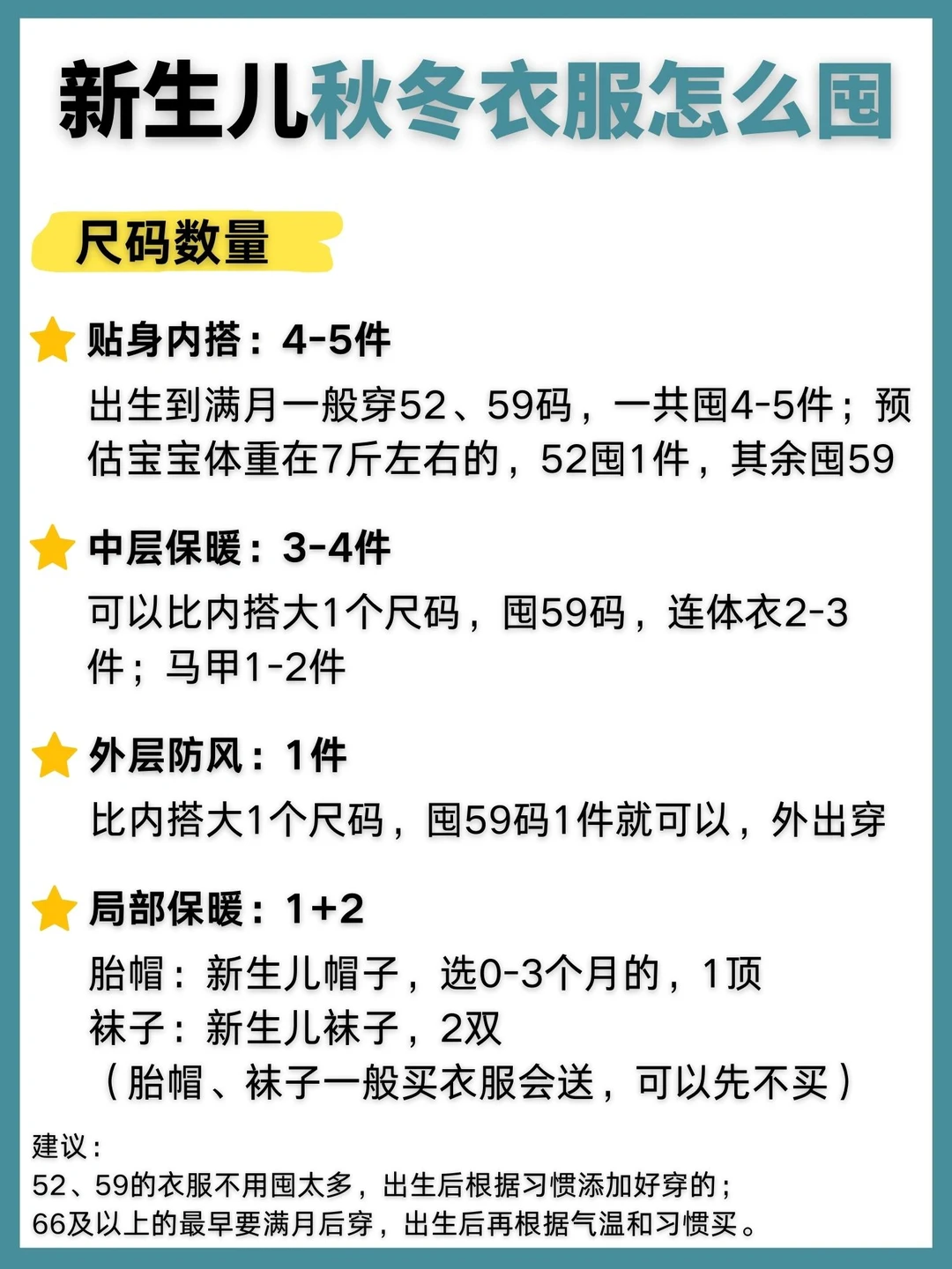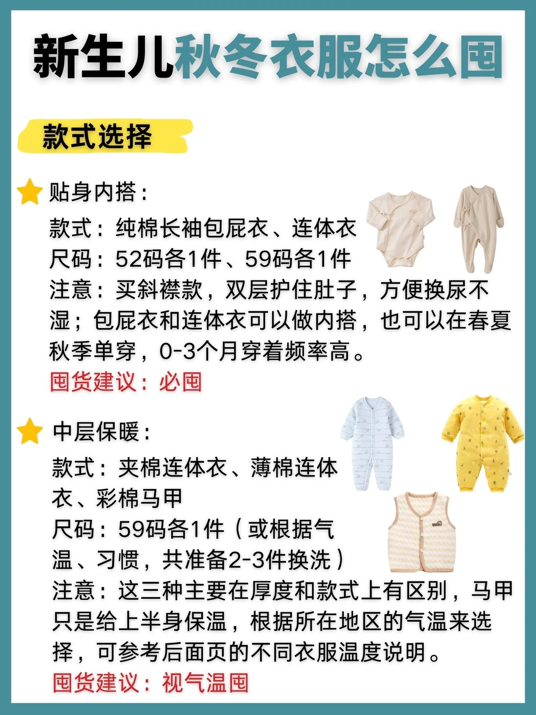 2.实在不知道买哪种,又怕闲置,就贴身衣服选2件59码连体衣;没暖气的中部和北方再买2件59码薄棉连体衣;南方或者有暖气的买2件59码夹棉连体衣;出生后穿着看情况再添加。