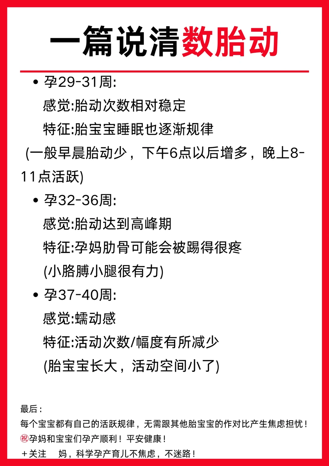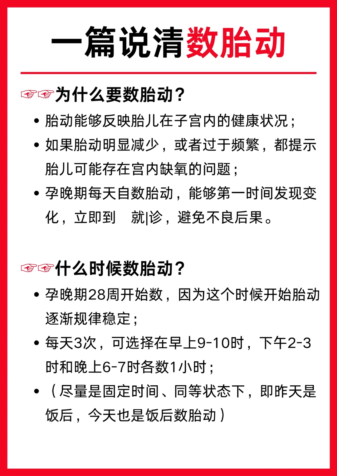 如果胎动明显减少,或者过于频繁,都提示胎儿可能存在宫内缺氧的问题。孕晚期每天自数胎动,能够第一时间发现变化,立即到🏥就诊,避免不良后果。