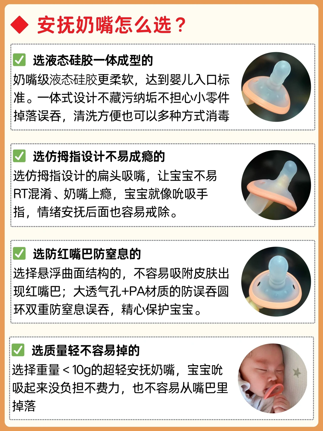 🌈 关于安抚奶嘴,我真的是听到过很多不同的版本,该不该用?什么时候用?用多久?翻遍了两本育儿宝典《崔玉涛育儿百科》《美国儿科学会育儿大百科》,关于安抚奶嘴的建议统一又明确,给大家整理出来,希望可以帮助到各位新手爸妈! · 🌈 先说结论:小婴儿能用安抚奶嘴! ⚠️使用的前提是: 1.宝宝出生3-4周后,6个月内,不饿的情况下还有吮吸需求 2.肠胀气、疲惫烦躁、进入新环境有不安情绪 3.其他安抚不起作用,比如抱抱、喂奶、玩具 4.晚上入睡困难,哭闹吃手 · 🌈 同时,美国儿科学会对安抚奶嘴的使用建议: 1.母乳喂养的宝宝出生3-4周后再使用,避免乳头混淆 2.不饿的情况下有吮吸需求再给,每次不超过20分钟,睡着后及时取出 3.宝宝不想用或者经常从嘴里掉出来,就不要强迫宝宝使用 4.安抚奶嘴有不同性状和大小,找到宝宝喜欢的多买几个,方便使用 5.不要将安抚奶嘴系在绳子上连在宝宝身上防掉落,防止被绳子勒住 6.安抚奶嘴2-3个月更换一次,如果有裂纹等需要立即更换 · ⭕️ 我家宝宝满月后用的这个佳尔优优拇指安抚奶嘴,我不担心她会乳头混淆和上瘾,因为它是仿拇指设计的,口腔里面接触点更多,能让宝宝区分吮吸手指和乳头。而且吮吸头入口长度<3.5cm,也不会干呕👍🏻。液态硅胶材质超级柔软,一体成型也不怕小零件掉落,边角圆润光滑不藏污不割嘴,悬浮3D曲面设计,两侧都有呼吸孔,不闷不红用着很放心。 ⭕️ 最最最重要的是小小的一个,竟然才8g,超级轻不容易掉落,宝宝吮吸拿握都很轻松,自然安抚不怕哭闹。 ⭕️ 这个小小的安抚奶嘴在宝宝口欲期真的是帮了我大忙!但是,妈妈们千万注意,在宝宝吮吸需求高的时候给用用,安抚哄睡着后要及时拿掉,饿了更要及时喂奶而不是塞安抚奶嘴。