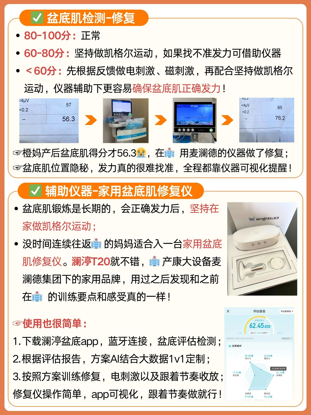 生了两次宝宝,一胎时没经验也走过一些弯路😭作为过来人,想对还未生或者还在月子里的姐妹们分享一些坐月子及产后恢复的经验建议! 📌 关于坐月子:具体看图2-4 📌 关于产后恢复:具体看图5-6 二胎时有经验了,产后42天做了检查,其他恢复的都很好,但是盆底肌评估得分才56.3。身边的朋友产后咳嗽、打喷嚏漏💧,甚至家里还有亲戚生完好几年后子宫T垂,都劝w去好好修复~ 但是去🏥做修复,一去就是大半天,宝宝要频繁喝奶很不方便;还要排队预约,时间难把握。 直到看到这款【澜渟T20盆底肌修复仪】,🏥产康大设备麦澜德集团下的家用品牌,同源同技术,会觉得可靠很多,这样自己在家也能轻松做修复啦~ 使用之前,先做一下盆底状况评估,它的评估系统是进阶版FSFI量表+国际标准6分17秒Glazer评估双向评估(国际标准&🏥同报告),评估非常全面,包含盆底肌和小花园的多项内容,智能AI顾问结合大数据1v1制定专属修复方案,还会有24小时在线康复师解答疑问,非常🧱业。 操作上也很方便,没有繁杂的连接线,蓝牙5·0的技术连接app又快又稳,无线一体设计,探头就是主机,不用时直接放进主机舱充电,和air pods一样的充电原理,它的探头也是通过了新国标的1000v耐高压测试,没有漏⚡风险,大家选的时候要注意这一点,毕竟是要进入身体使用的仪器~ 主机舱自带消🦠功能,除🦠率99.99%,方便又卫生;如果怕探头太冰凉刺激,也可以使用加热功能给探头加热到35℃,使用时会舒服很多 用了一段时间后发现和之前在🏥的训练要点和感受一样,电流刺激修复加上app交替指导做训练,配备的腹部监测可以实时监测肌肉的发力位置、力度等,避免发力错误做无用功,并且还会根据肌肉疲劳度自动调整训练难度,更容易坚持下去,特别适合独立带娃的妈妈们! 同时,根据身体情况,产后4-6个月适当恢复快走、慢跑、瑜伽等运动,早日恢复身材! 苏械广审(文)第260322-05022号 请仔细阅读产品说明书或者在医务人员的指导下购买和使用 禁忌内容或者注意事项详见说明书