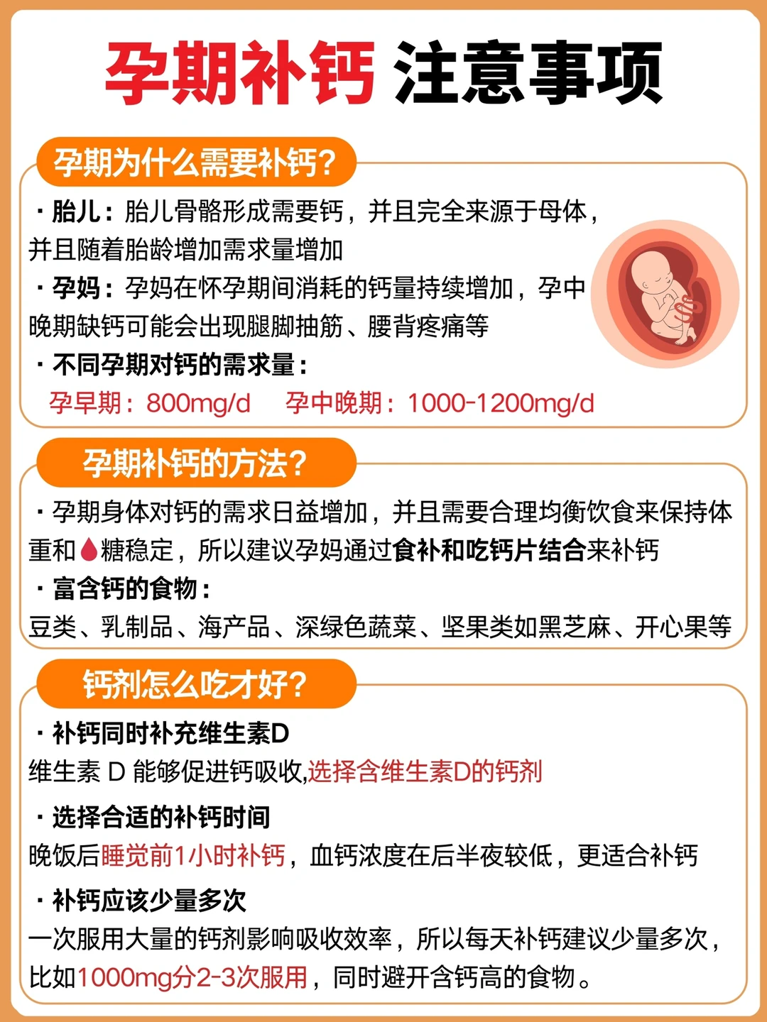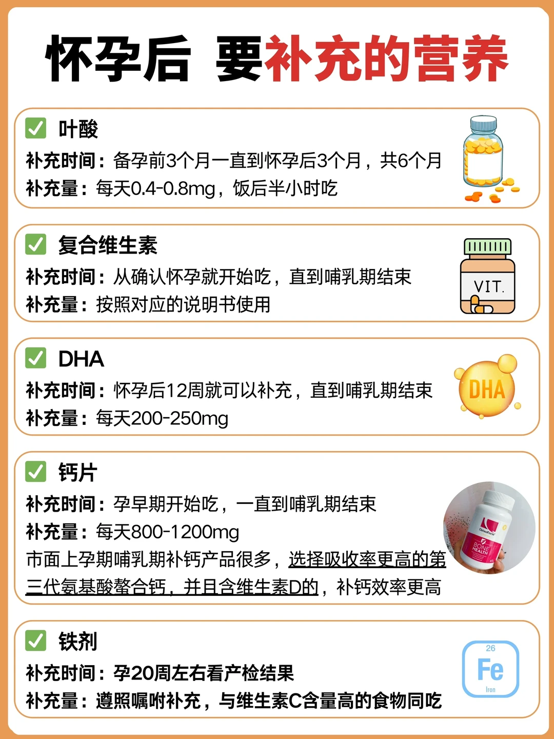 ✔️钙:孕早期到哺乳期都需要吃,孕早期800mg/d,孕中晚期1000-1200mg/d