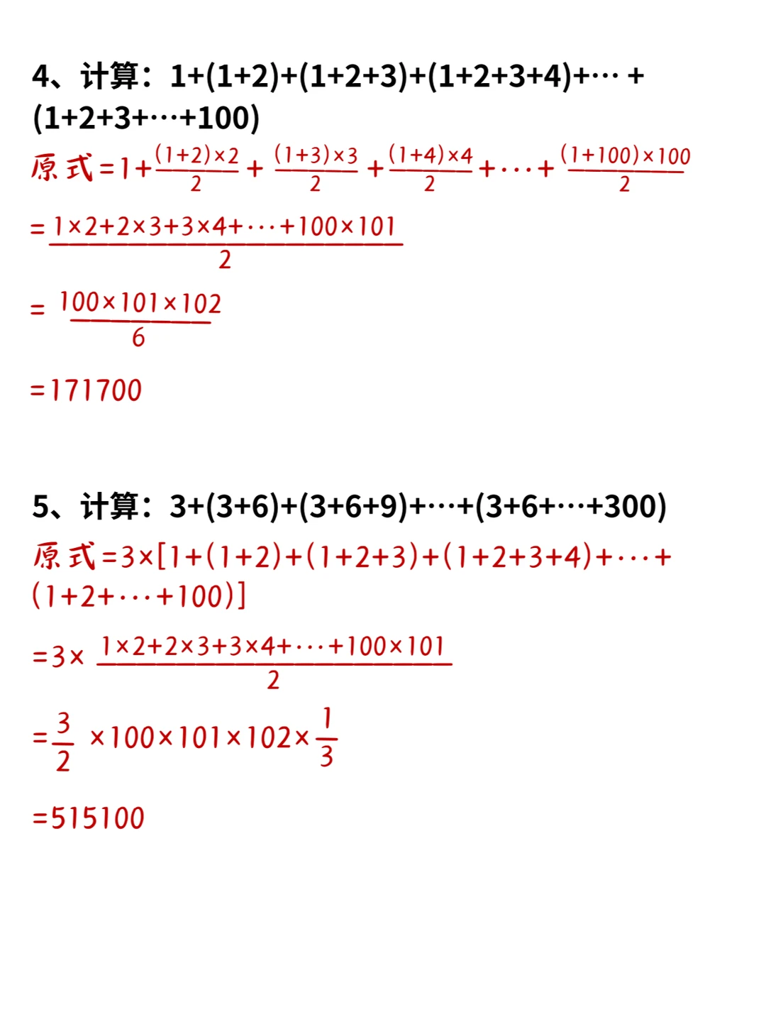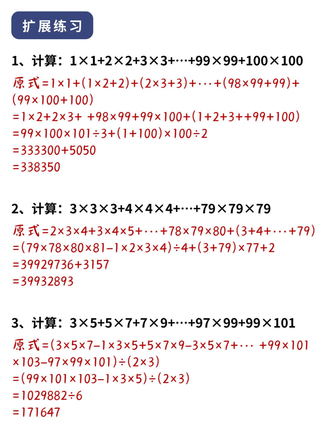 【复杂整数裂项型运算】 👨‍🏫特点:从公差一定的数列中依次取出若干个数相乘,再把所有的乘积相加。 ✅巧解方法:先把算式中最后一项向后延续一个数,再把算式中最前面一项向前伸展一个数,用它们的差除以公差与因数个数加1的乘积。 🚀整数裂项口诀:等差数列数,依次取几个。所有积之和,裂项来求作。后延减前伸,差数除以N。N取什么值,两数相乘积。公差要乘以,因个加上一。 💥需要注意的是:按照公差向前伸展时,当伸展数小于0时,可以取负数,当然是积为负数,减负要加正。对于小学生,这时候通常是把第一项甩出来,按照口诀先算出后面的结果再加上第一项的结果。 ✅此外,有些算式可以先通过变形,使之符合要求,再利用裂项求解。