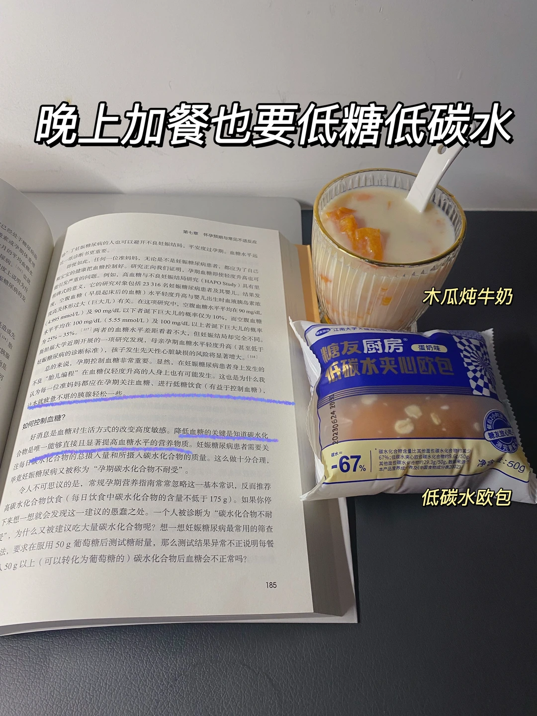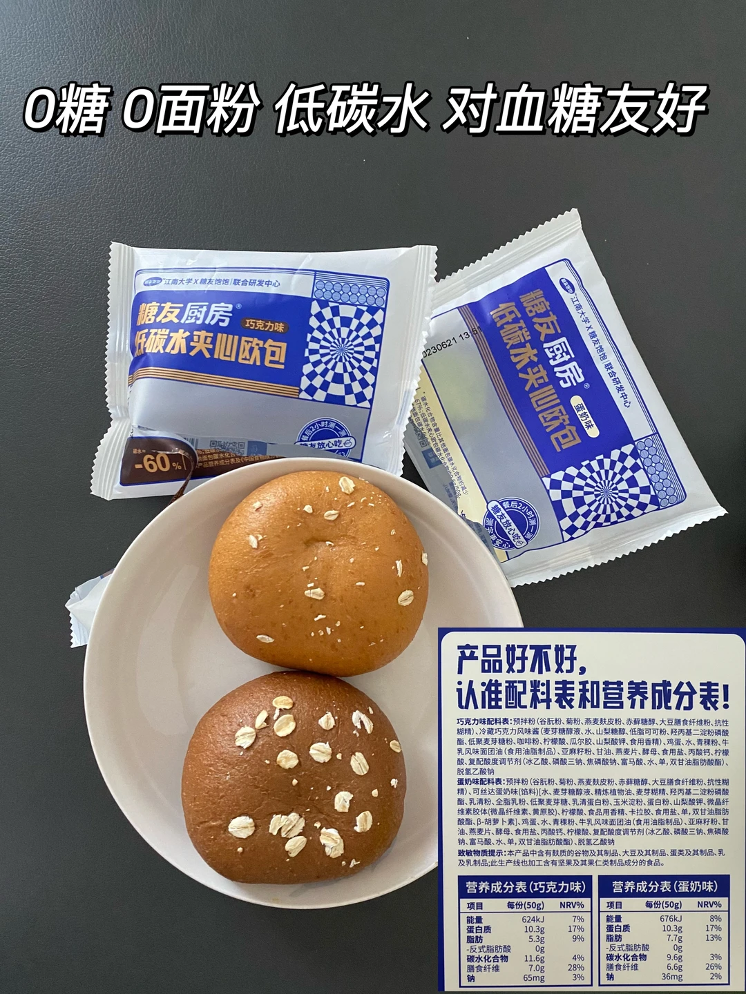 孕期到哺乳期加餐选择少量碳水+低gi水果,或少量碳水+蛋白质。碳水一开始是自制全麦面包,但是麻烦,口感也没有那么好。后面换了这个低碳水夹心欧包,有2种口味,蛋奶夹心和巧克力夹心,两个换着吃,我的加餐都开心了很多。碳水摄入量是影响血糖的关键,这个欧包(蛋奶味)的碳水含量仅仅9.6g/50g,比普通面包减少了约67%,多吃两个也不怕波动剧烈了。