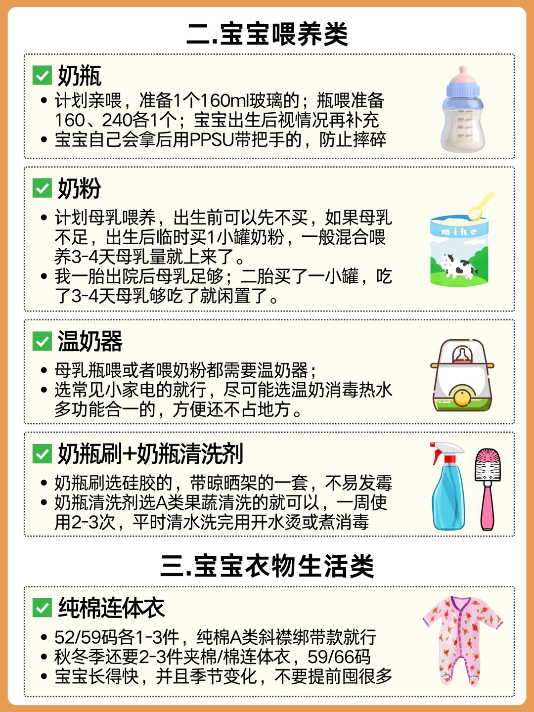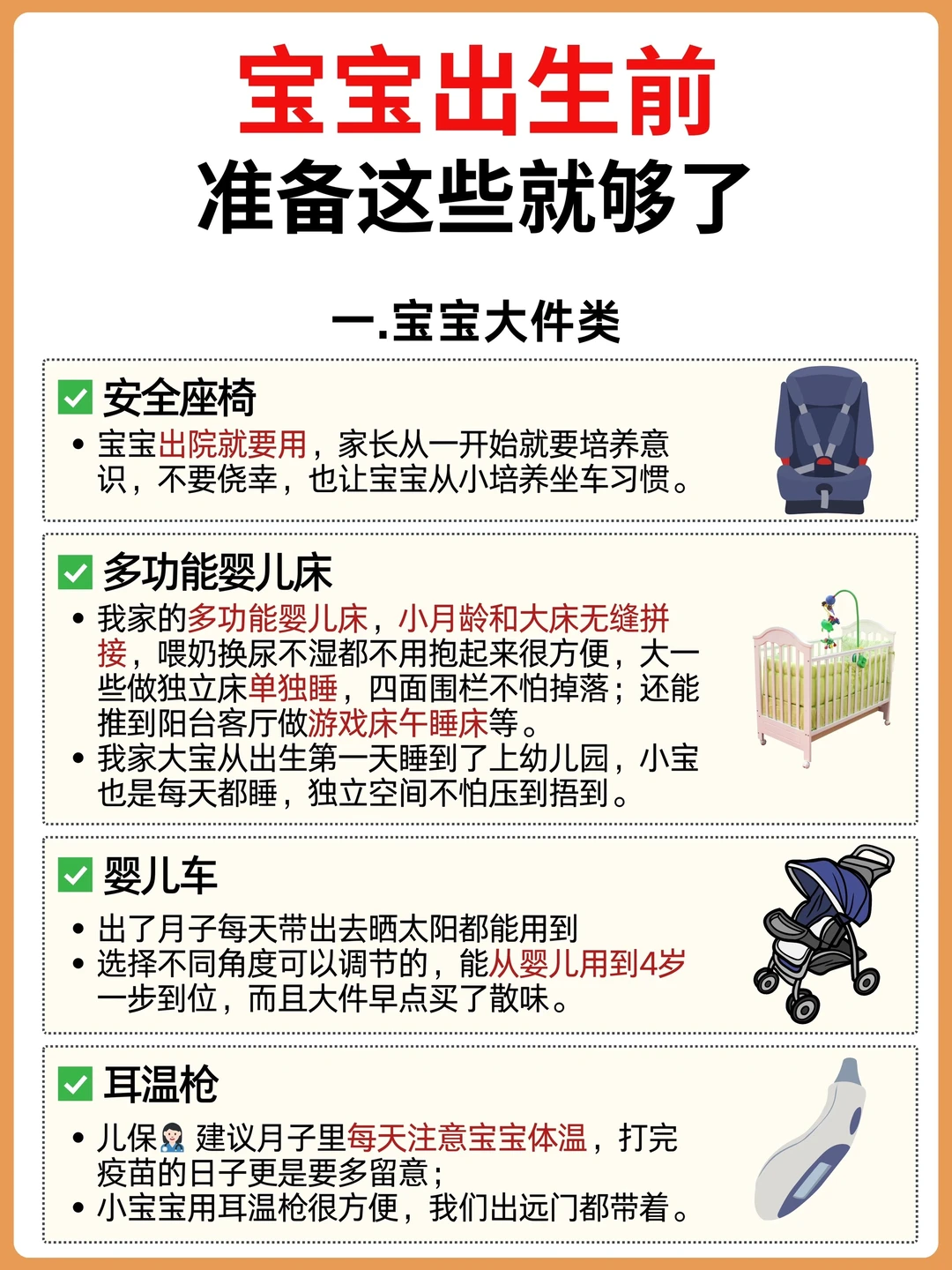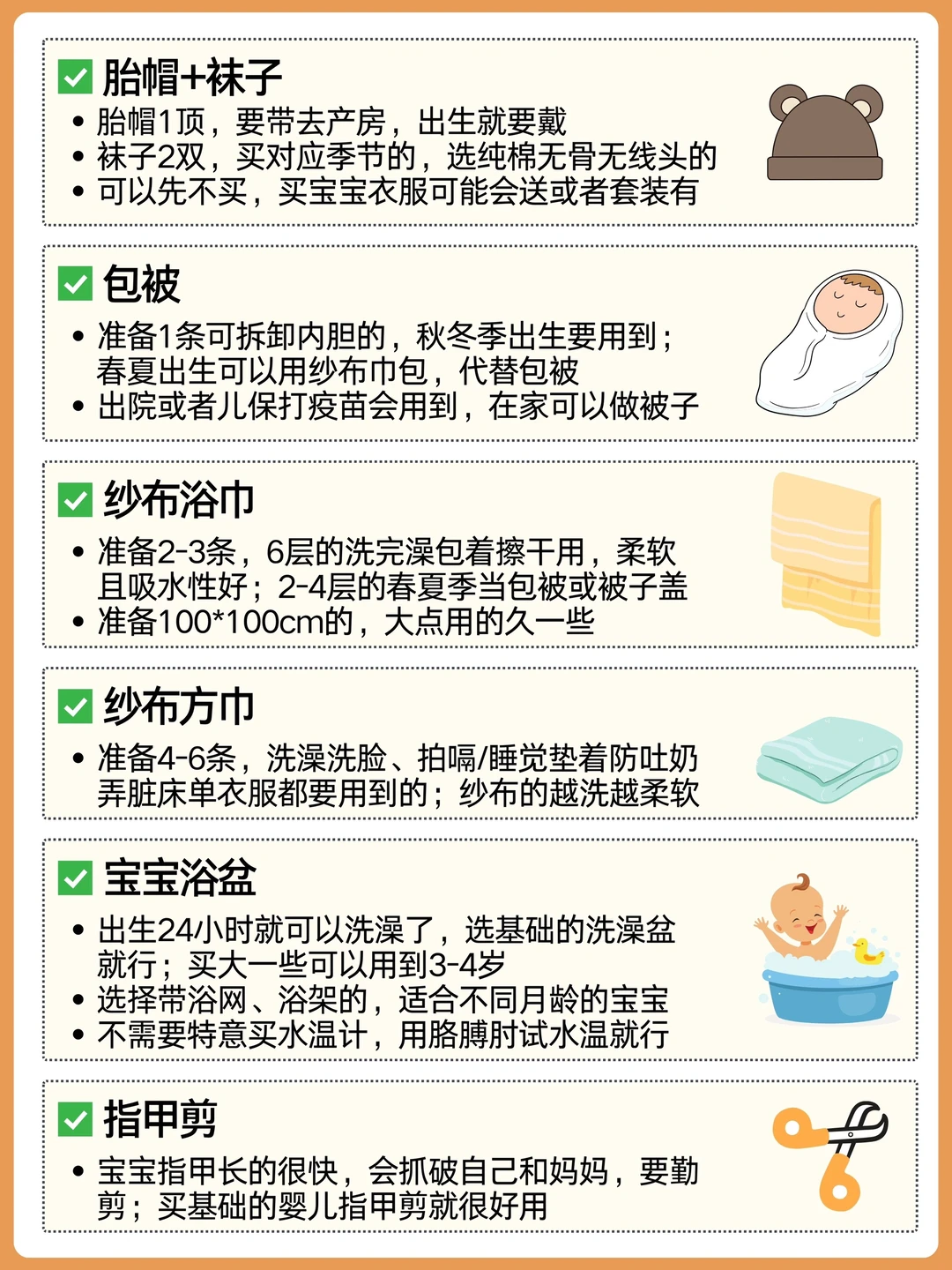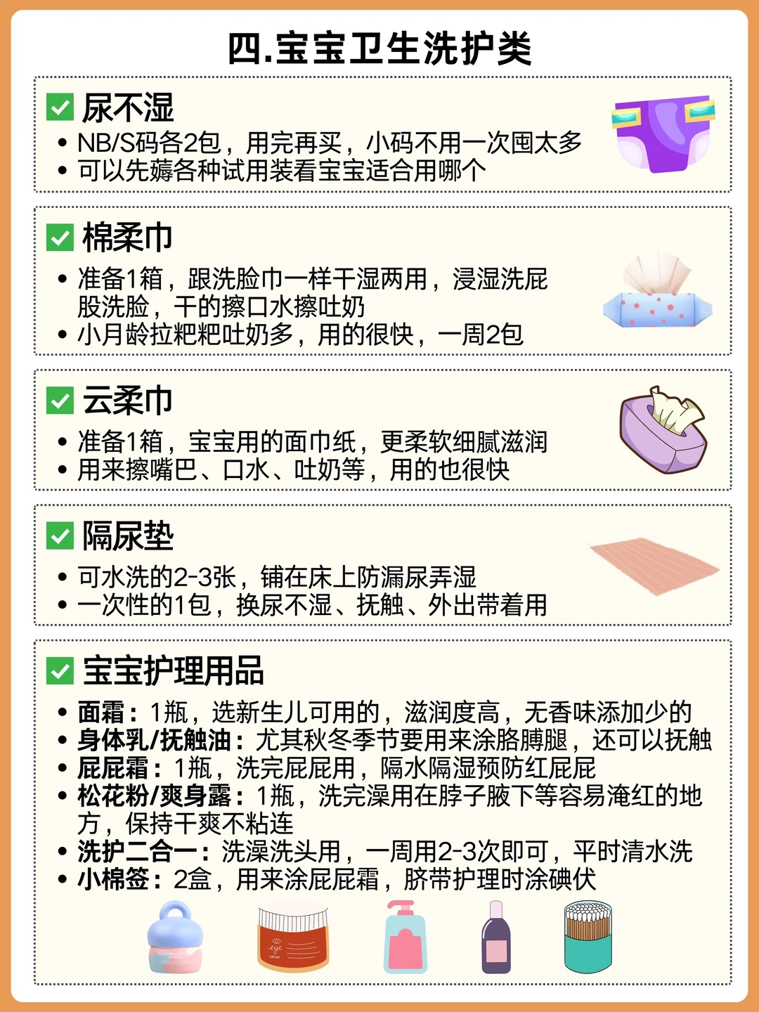 安全座椅、多功能婴儿床、婴儿车、耳温枪、奶瓶、温奶器、奶瓶刷、纯棉连体衣、胎帽、袜子、包被、纱布浴巾、小方巾、浴盆、指甲剪、尿不湿、棉柔巾、云柔巾、隔尿垫、保湿霜、屁屁霜、洗护二合一、润体乳、小棉签