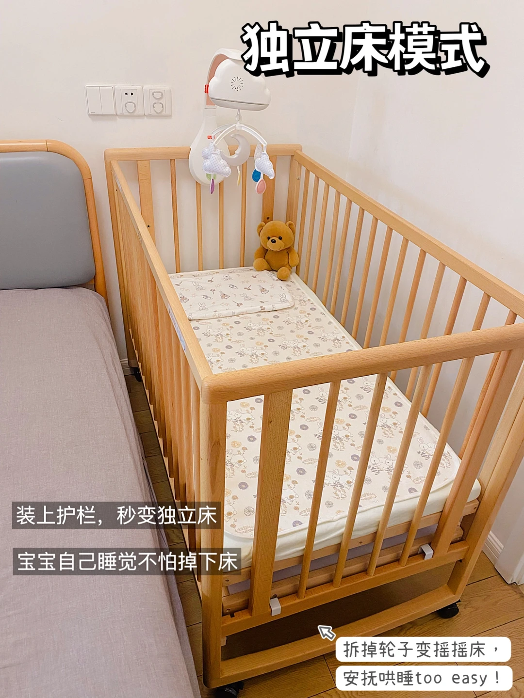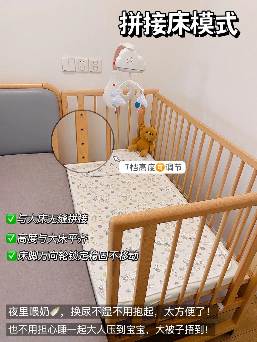 🌈 像小宝现在小月龄,我们把婴儿床调节到和大床一样高,就是拼接床了。晚上躺着喂奶、换尿不湿都不用抱起来,特别方便;两张床又相对独立,宝宝自己睡觉也避免了被我们压到、被大被子捂到的风险。四角的轮子拔掉秒变摇摇床,接觉难、落地醒都不是问题,连摇篮摇椅的💰都省了。等宝宝大一些睡整觉了,就把两侧的围栏都装好,床板高度调低变独立婴儿床,宝宝自主睡觉互不打扰,也不担心夜里翻身打滚掉落。推到客厅调到最低档,宝宝可以在里面扶站学走游戏不怕摔倒掉下来。等宝宝大了,这个实木婴儿床还可以变成画板、书桌,学习空间就这么轻松打造好了,直接省下大几千……
