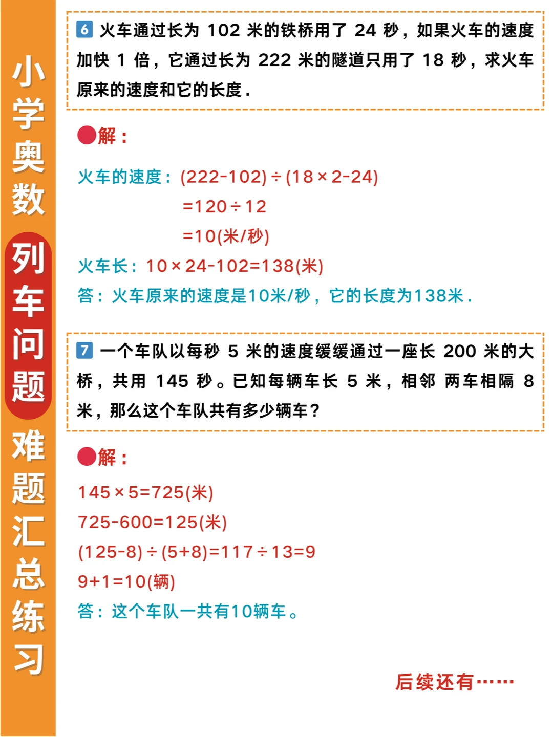6️⃣题必须考虑到车身的长度,即列车运动的总路程是桥长加上车长,这是解答过桥问题应用题的关键