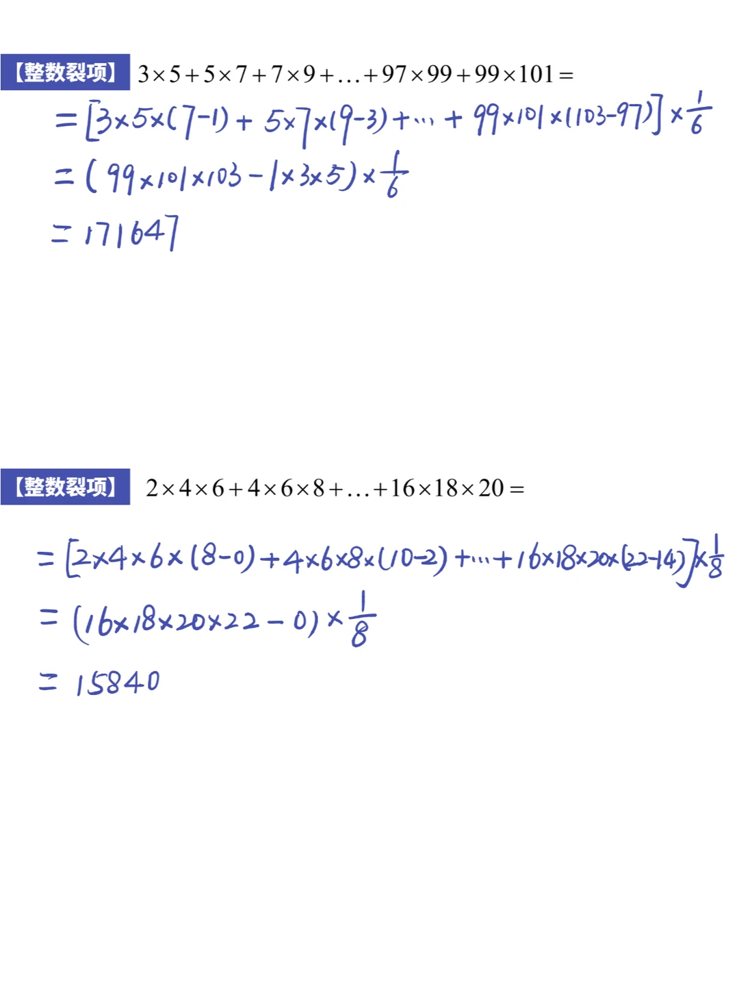 👉整数裂项凑的是等差数列一加一减的牵手关系,从上面题目可以看出基础的整数裂项性质: