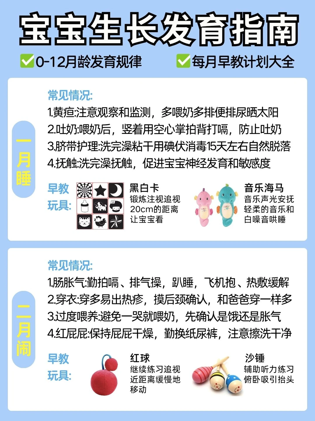 🌈 宝宝出生到一岁,是身体和大脑发育非常重要的阶段!每个月都会有很大的变化,养育和家庭早教的侧重点也都有区别。给大家整理了0-12月龄宝宝的生长发育规律、注意事项及早教方案。各位新手爸妈可以码住,按月在家做早教,培养聪明健康宝宝!