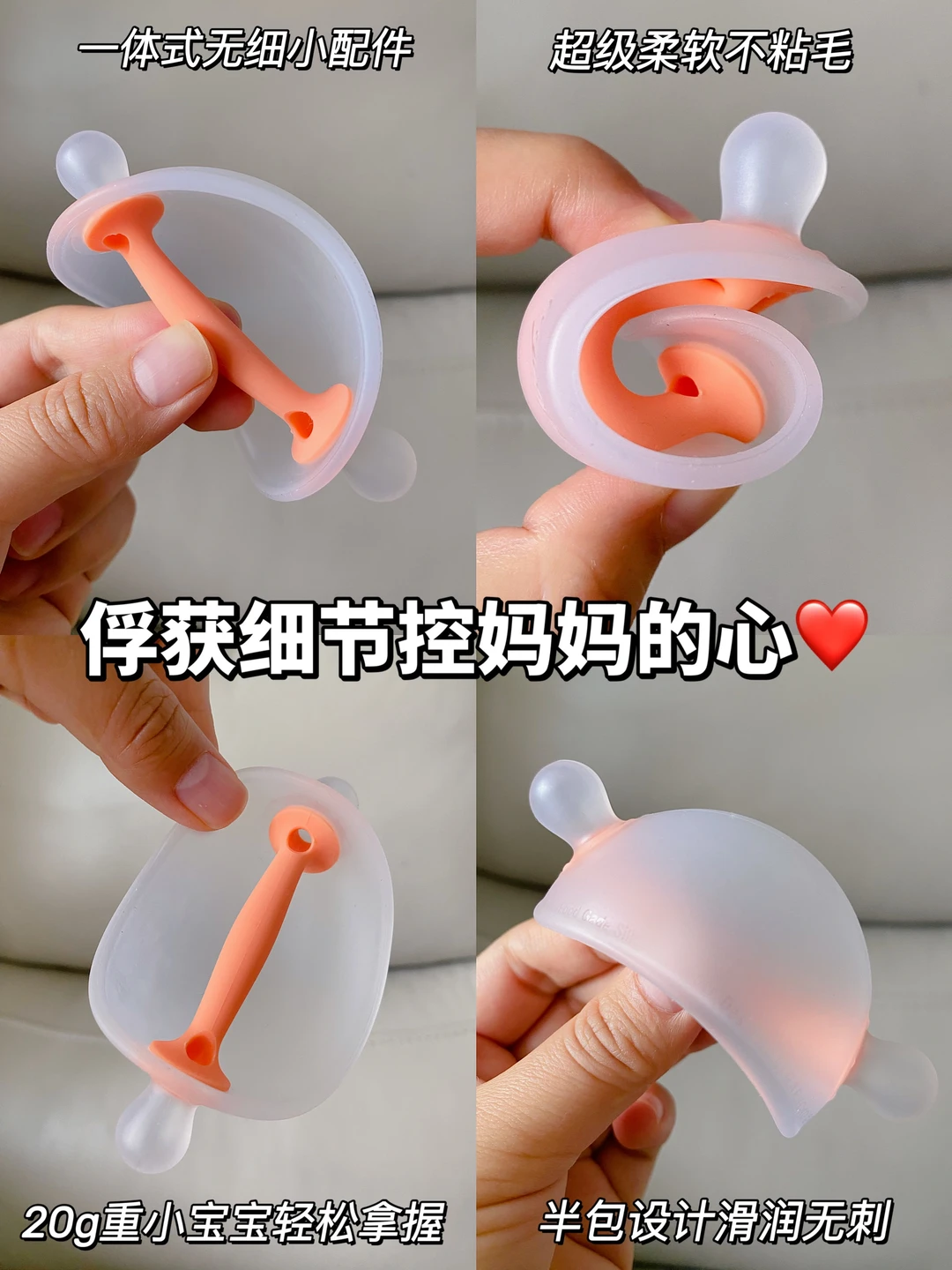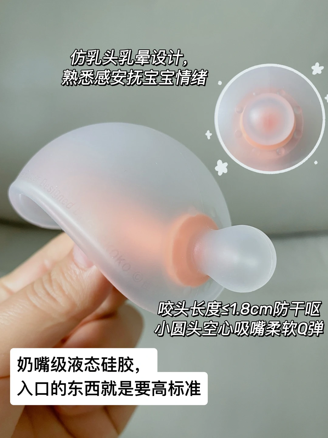 🍃它真的像一个小头盔一样半包着宝宝的小手,防止手被吸红吸肿;仿neinei状的空心吸嘴+乳晕设计,就像妈妈在在母乳亲喂,宝宝吸着更有熟悉感,每次焦躁时给她吸,情绪很快就能平静下来。