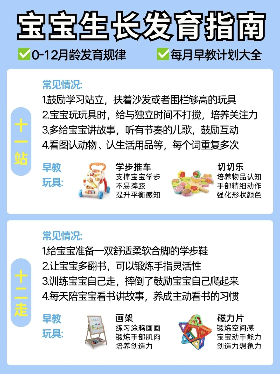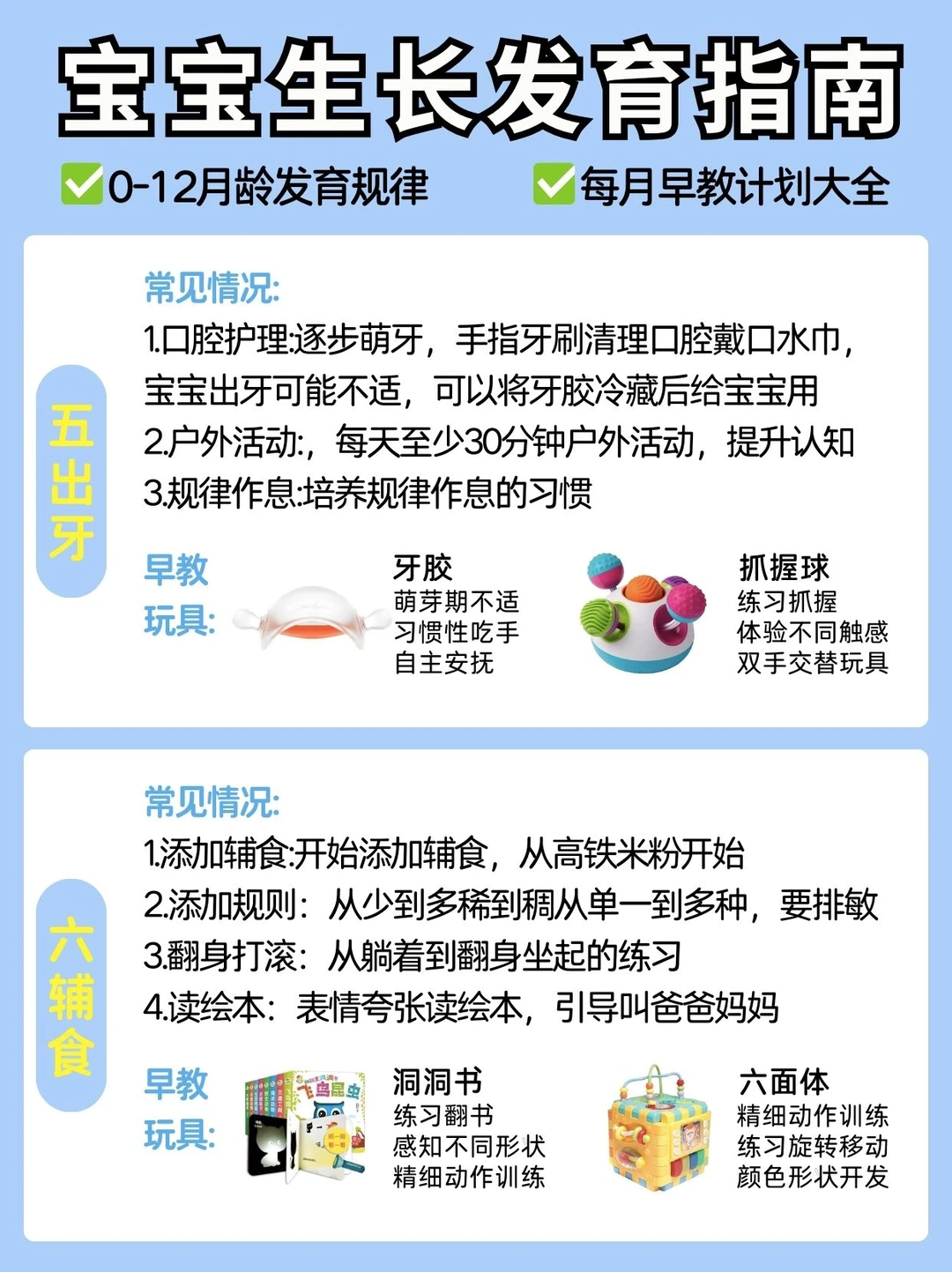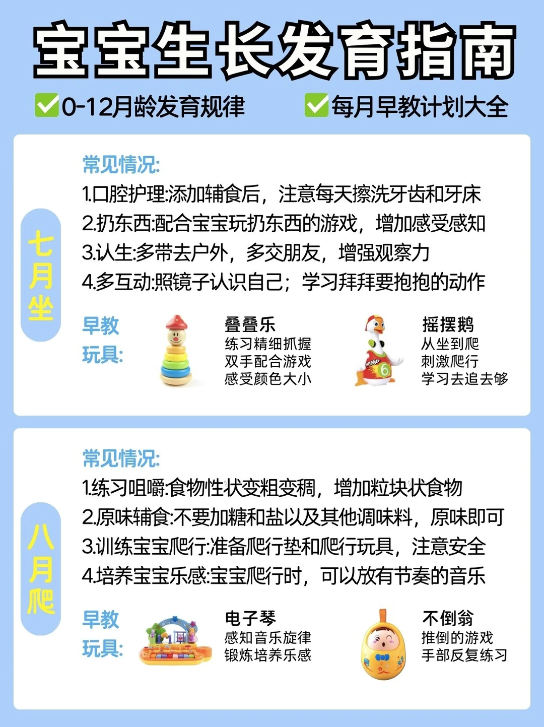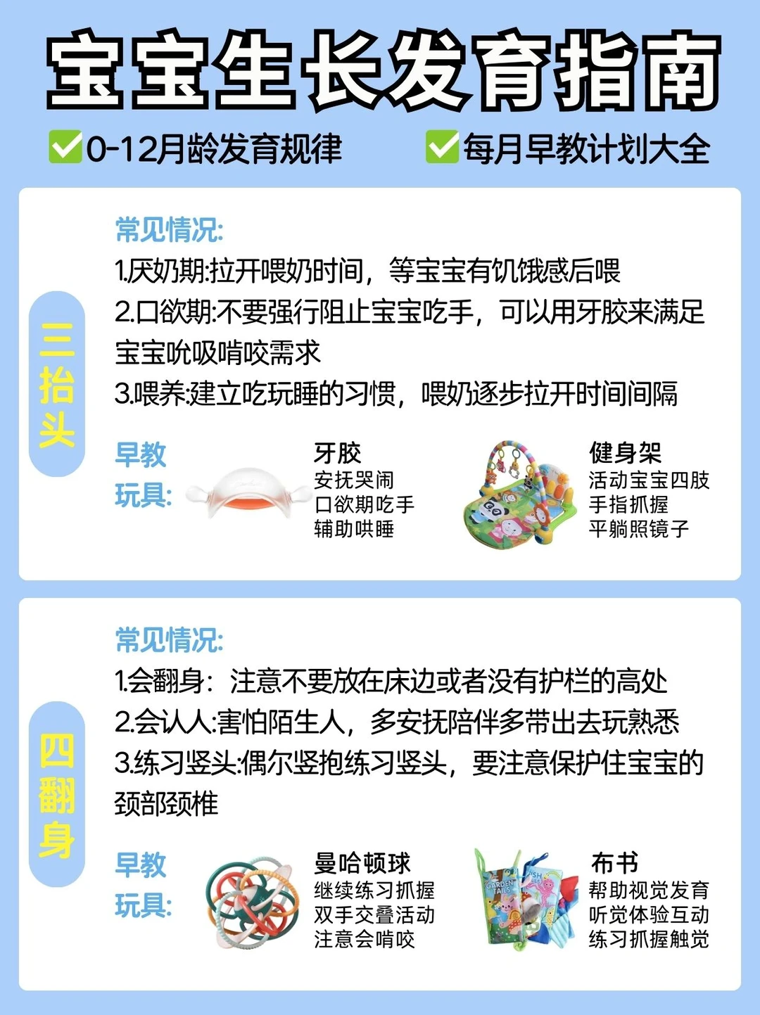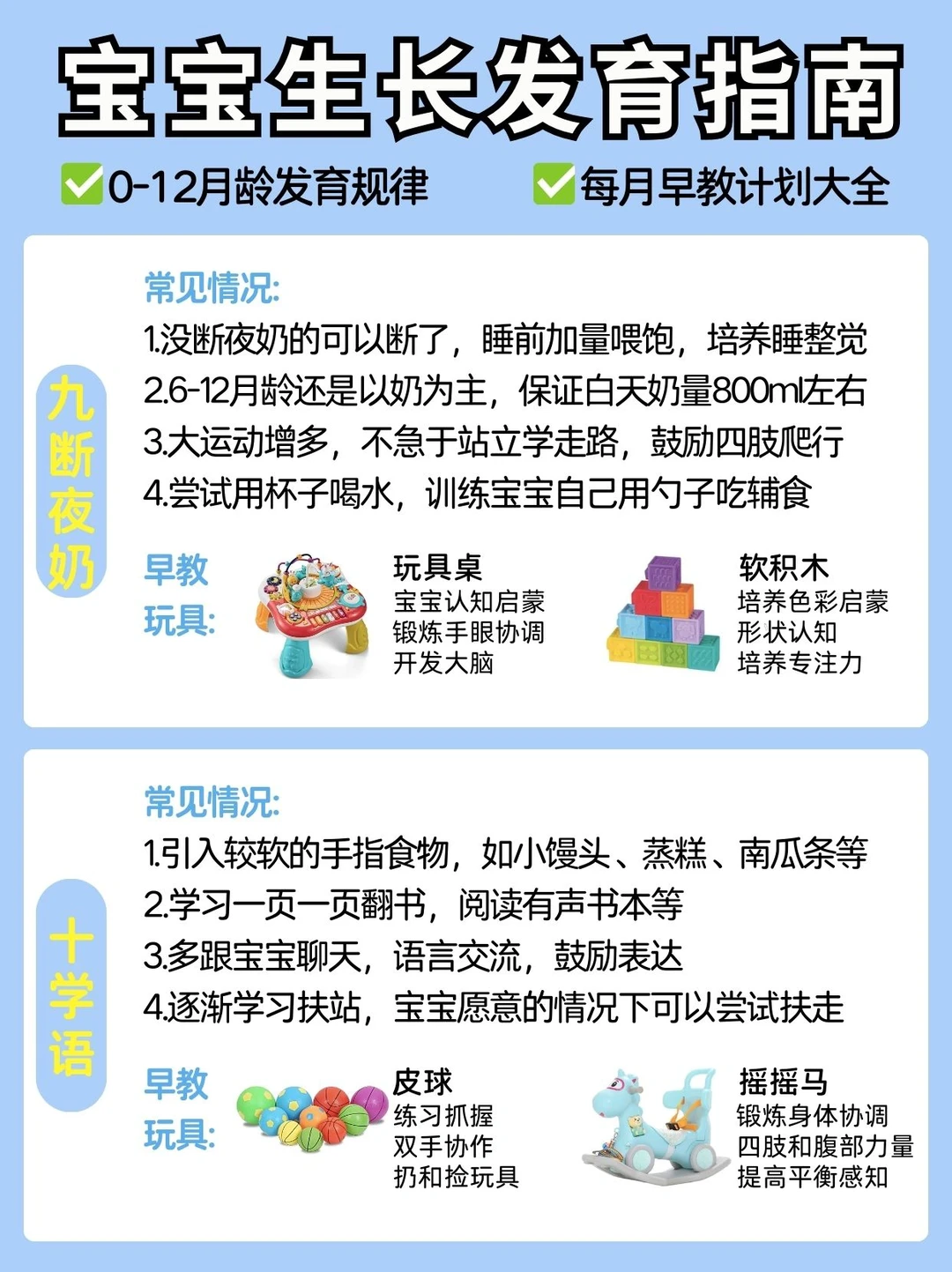 一月睡,二月闹,三抬头,四翻身,五出牙,六辅食,七月坐,八月爬,九断夜奶,十学语,十一站,十二走