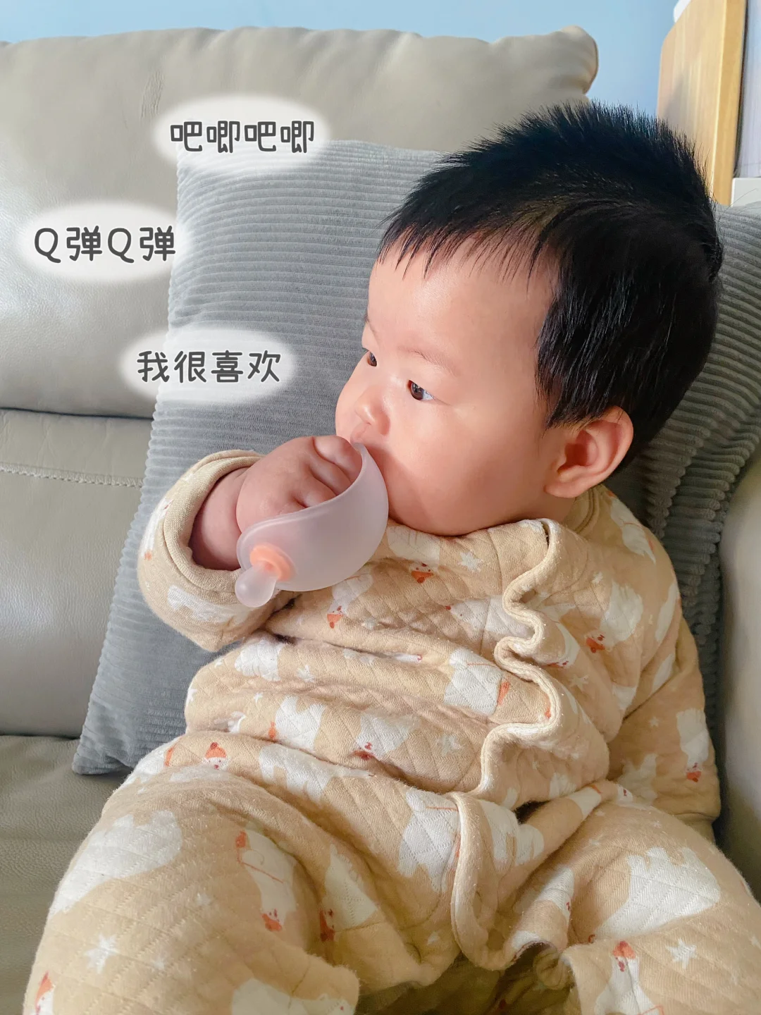 🍃不到1.8cm长的吸嘴,宝宝怎么吃都不会吸得很深引起干呕。和奶嘴同款的硅胶材质真的是超级柔软Q弹,才20g重,宝宝轻松的抓着它想怎么吃怎么吃,一点不费力。一体式的设计没有任何小零件和藏污纳垢的死角,这个牙胶的设计师真的是太懂宝宝和妈妈了!
