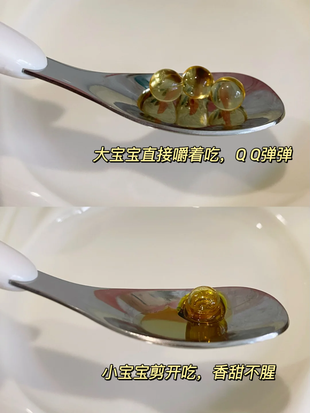 两种都是草莓味,吃着不腥,孩子们都很喜欢。小金珠外皮薄薄的,轻轻一咬就破了,外皮也能吃,1岁的小宝直接吃也不担心卡喉,特别省心。