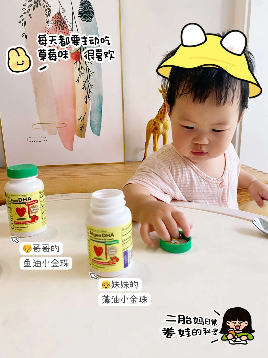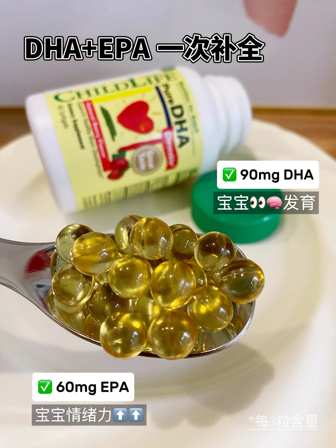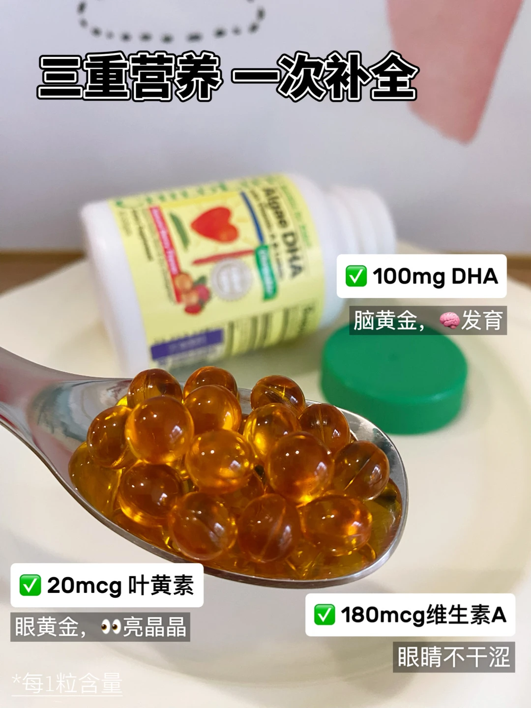 我之前给两个宝宝都吃的是ChildLife藻油DHA,原料提取自优质裂壶藻,更纯净更好吸收,每颗含有100mgDHA,浓度高达53%,特别适合小宝宝。与其他DHA不同的是,它还额外添加了叶黄素和维生素A,每天1颗补充3种营养,脑🧠眼👀黄金一起补,再也不用瓶瓶罐罐吃好几种了!
