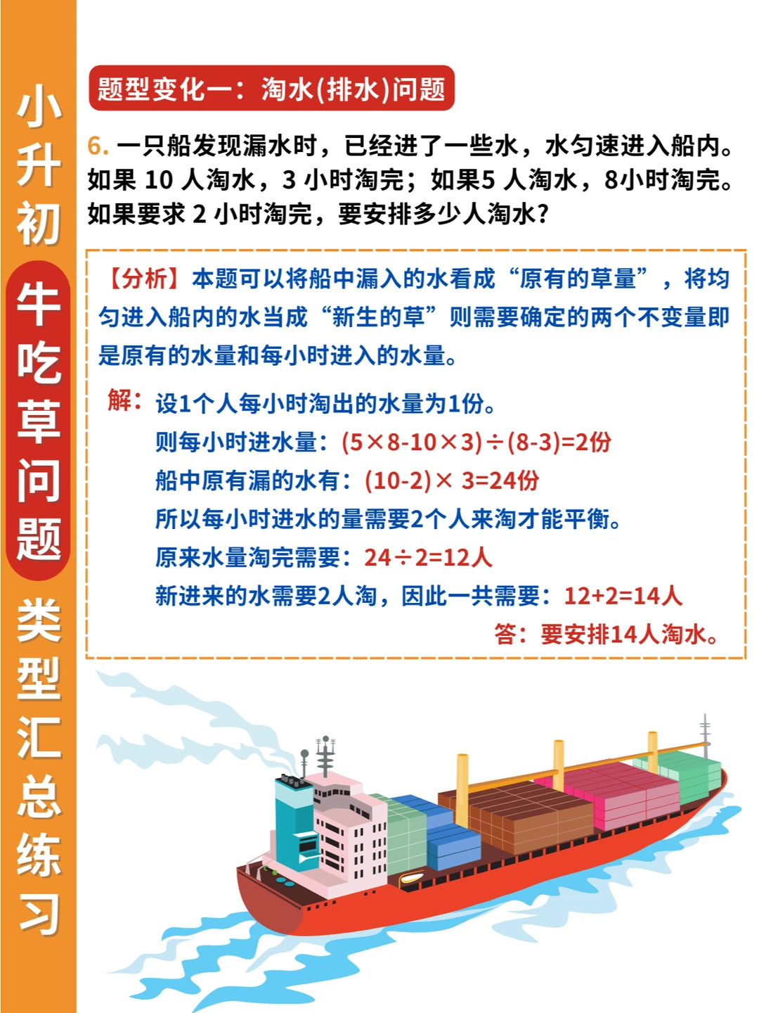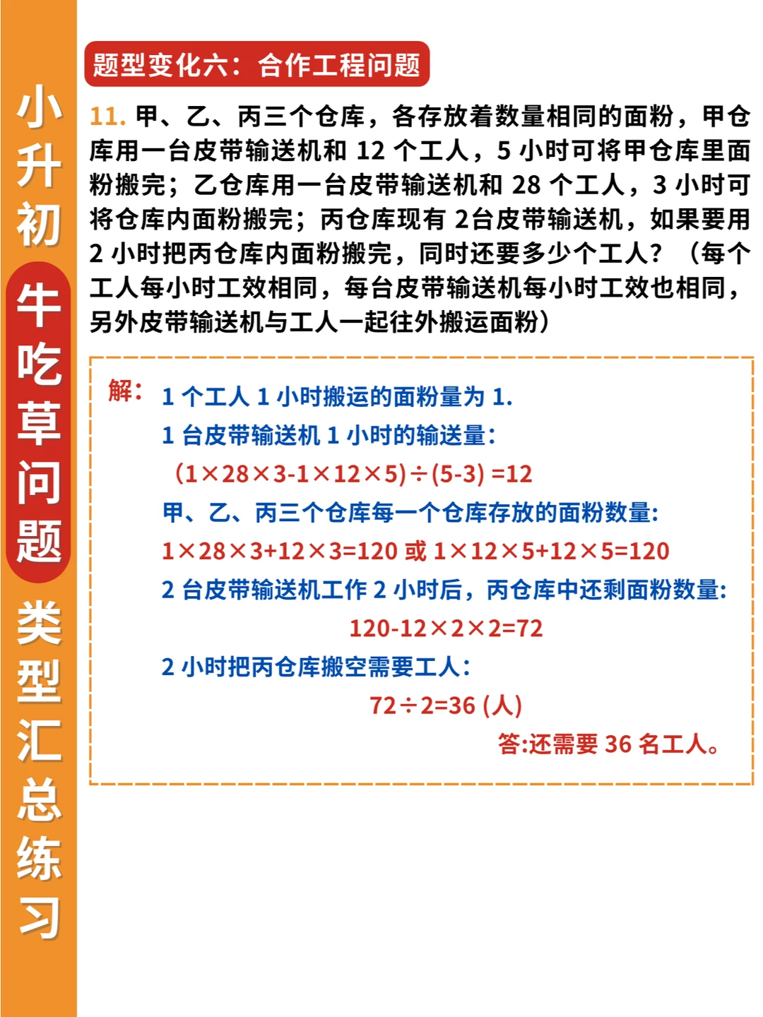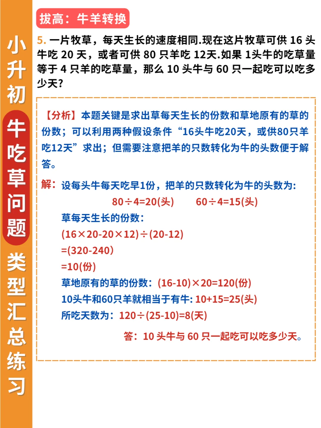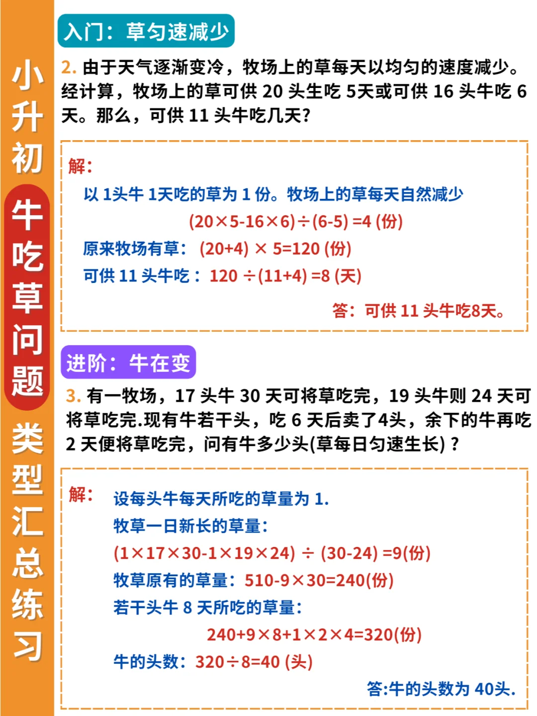 举一反三❗牛吃草问题不仅要掌握条件变化,还要掌握题型变化✅ 🔎条件变化: 1️⃣草匀速增长 2️⃣草匀速减少 3️⃣牛的数量变化 4️⃣草的数量变化 5️⃣牛羊的数量转换 🔎题型变化: 1️⃣淘水(排水)问题 2️⃣人口资源问题 3️⃣排队问题 4️⃣漏水问题 5️⃣水管问题 6️⃣扶梯问题 7️⃣工程合作问题 👨‍🏫解决牛吃草问题要抓住两个关键量: 一是单位时间内新生草量,即草差/时间差 二是原有草量,即总草量-新生草量 简单的牛吃草问题会以“草”为主,复杂的牛吃草问题,则会以“牛”为主进行条件变化。 其实学到后面,牛吃草问题,可以归类到工程问题中,这也是为什么小升初考试中会常考到这类问题。因为既具有知识性、趣味性,又具有思想性。而且升入初中之后还会继续学到~