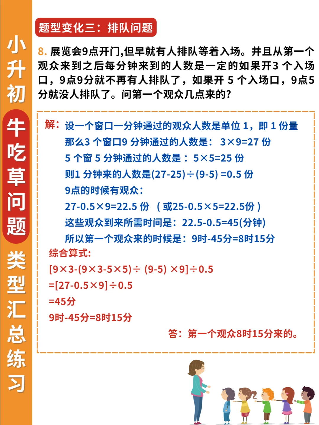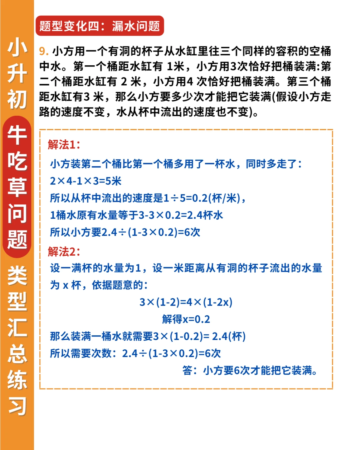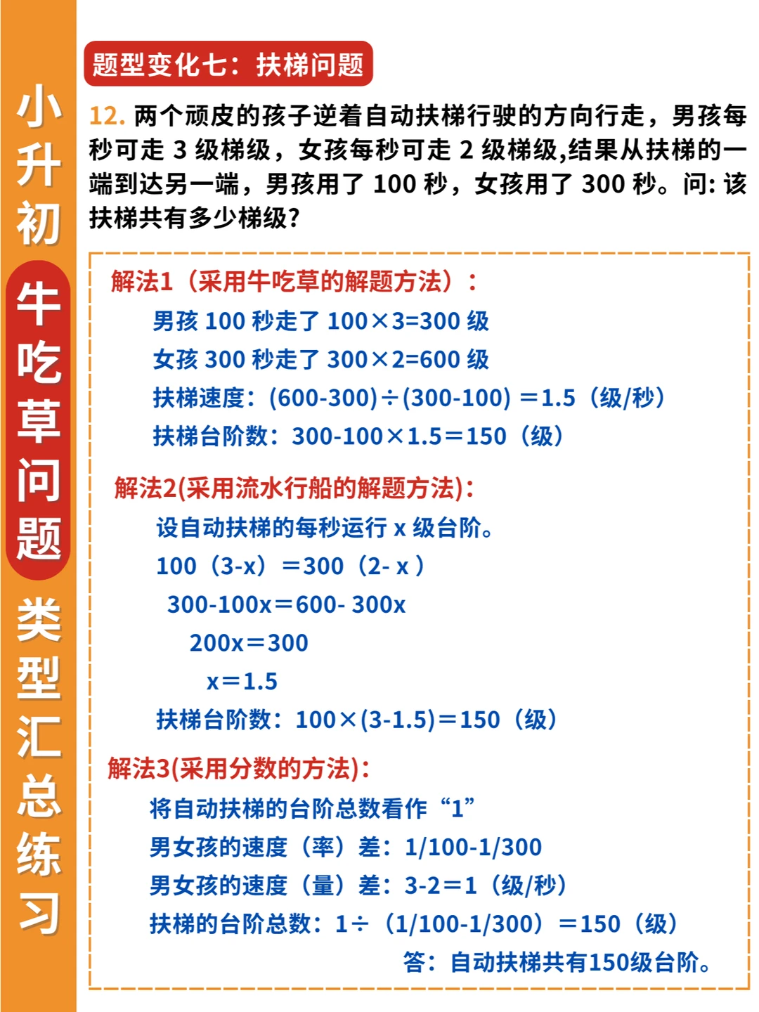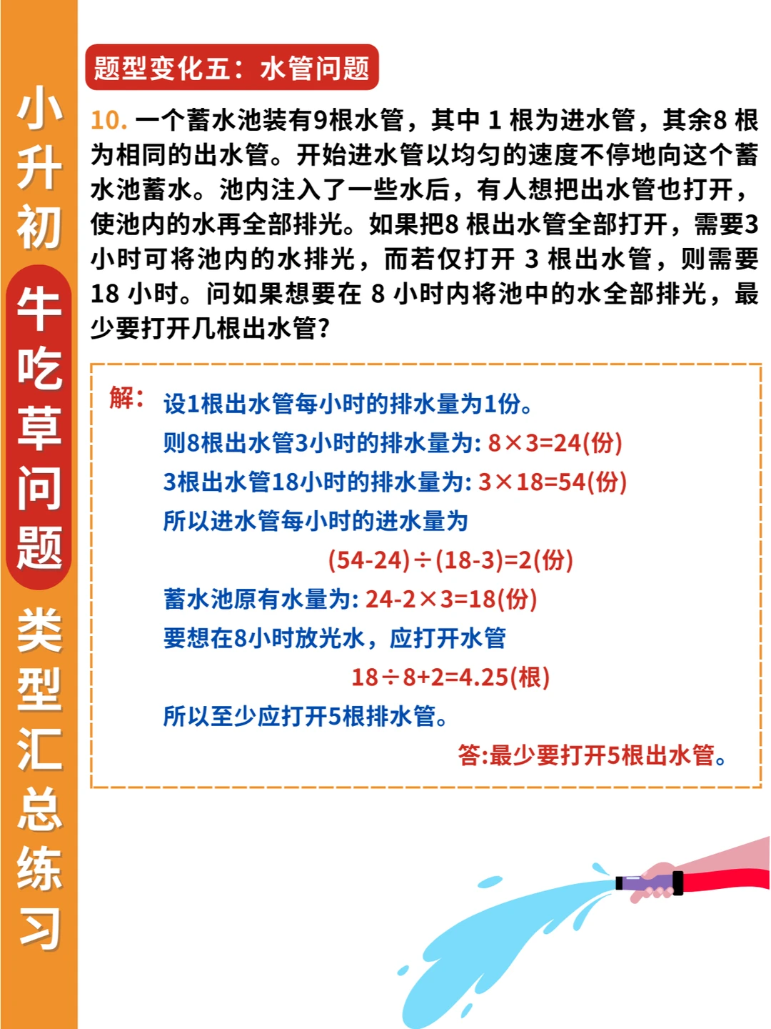 举一反三❗牛吃草问题不仅要掌握条件变化,还要掌握题型变化✅ 🔎条件变化: 1️⃣草匀速增长 2️⃣草匀速减少 3️⃣牛的数量变化 4️⃣草的数量变化 5️⃣牛羊的数量转换 🔎题型变化: 1️⃣淘水(排水)问题 2️⃣人口资源问题 3️⃣排队问题 4️⃣漏水问题 5️⃣水管问题 6️⃣扶梯问题 7️⃣工程合作问题 👨‍🏫解决牛吃草问题要抓住两个关键量: 一是单位时间内新生草量,即草差/时间差 二是原有草量,即总草量-新生草量 简单的牛吃草问题会以“草”为主,复杂的牛吃草问题,则会以“牛”为主进行条件变化。 其实学到后面,牛吃草问题,可以归类到工程问题中,这也是为什么小升初考试中会常考到这类问题。因为既具有知识性、趣味性,又具有思想性。而且升入初中之后还会继续学到~
