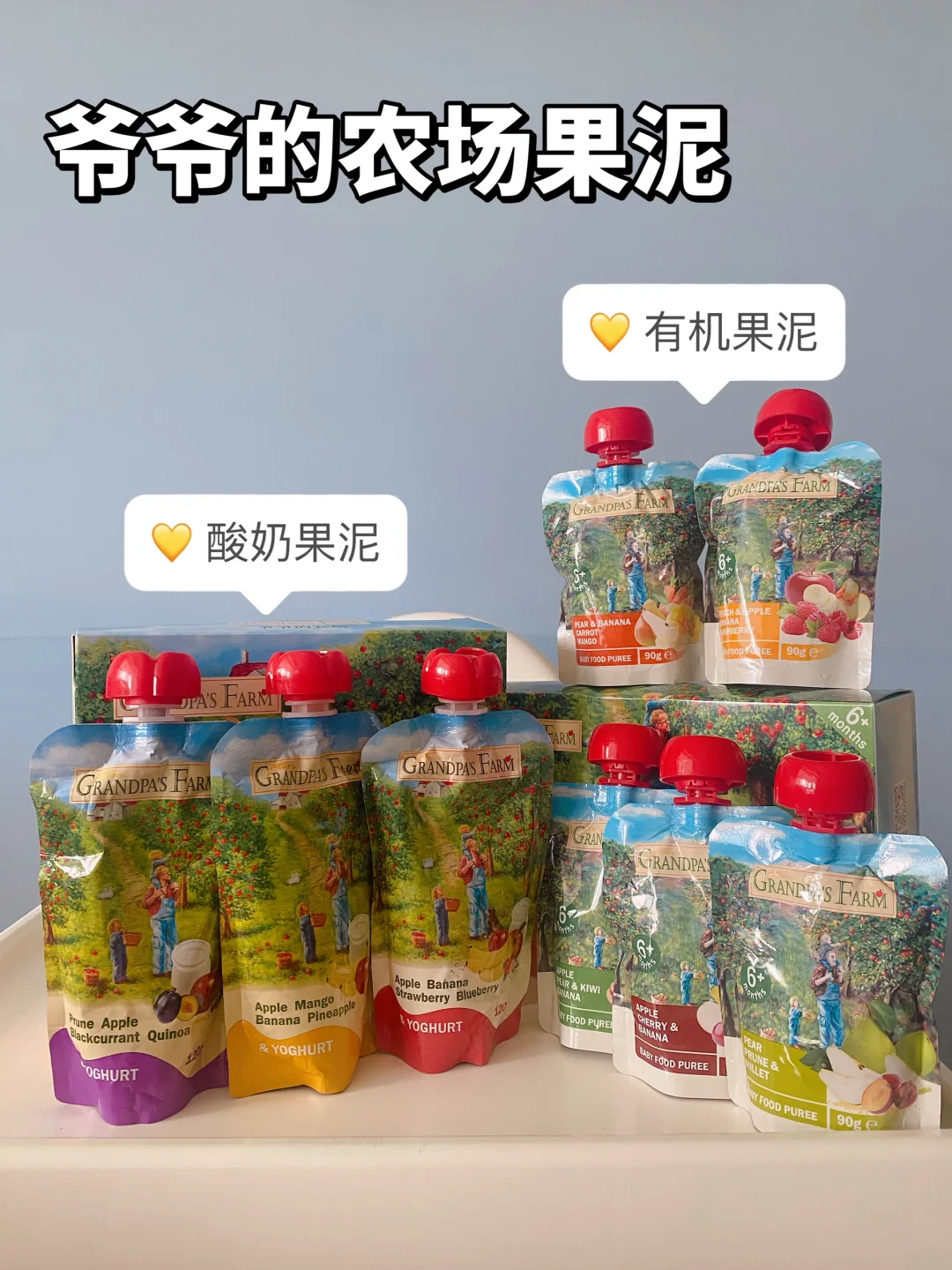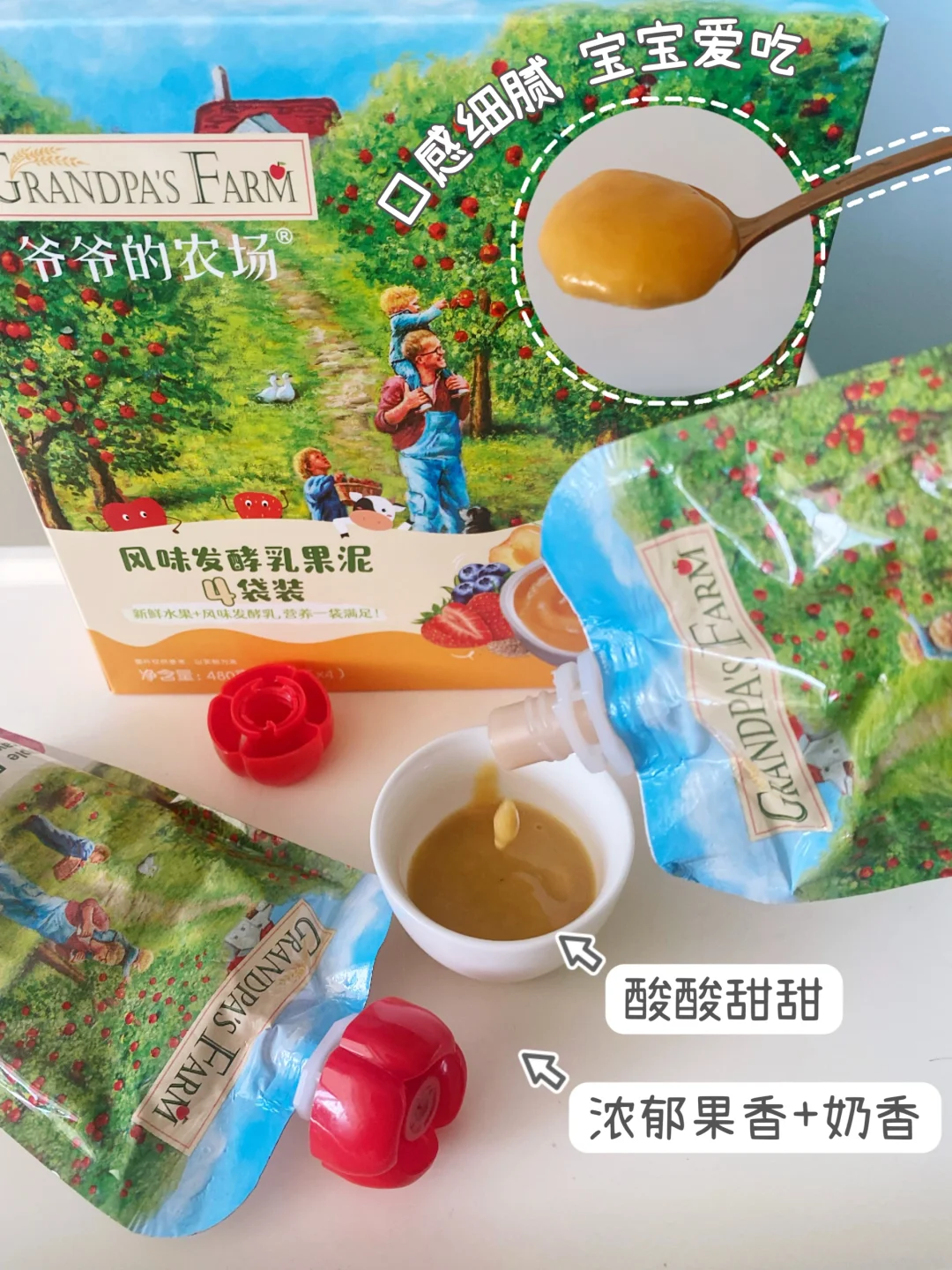 ✨宝宝👧🏻1岁后可以吃爷爷的农场酸奶果泥,生牛乳🥛发酵,还添加了3种益生菌,奶香+果香浓郁😋,我家大宝👦🏻每次都要和妹妹抢着吃