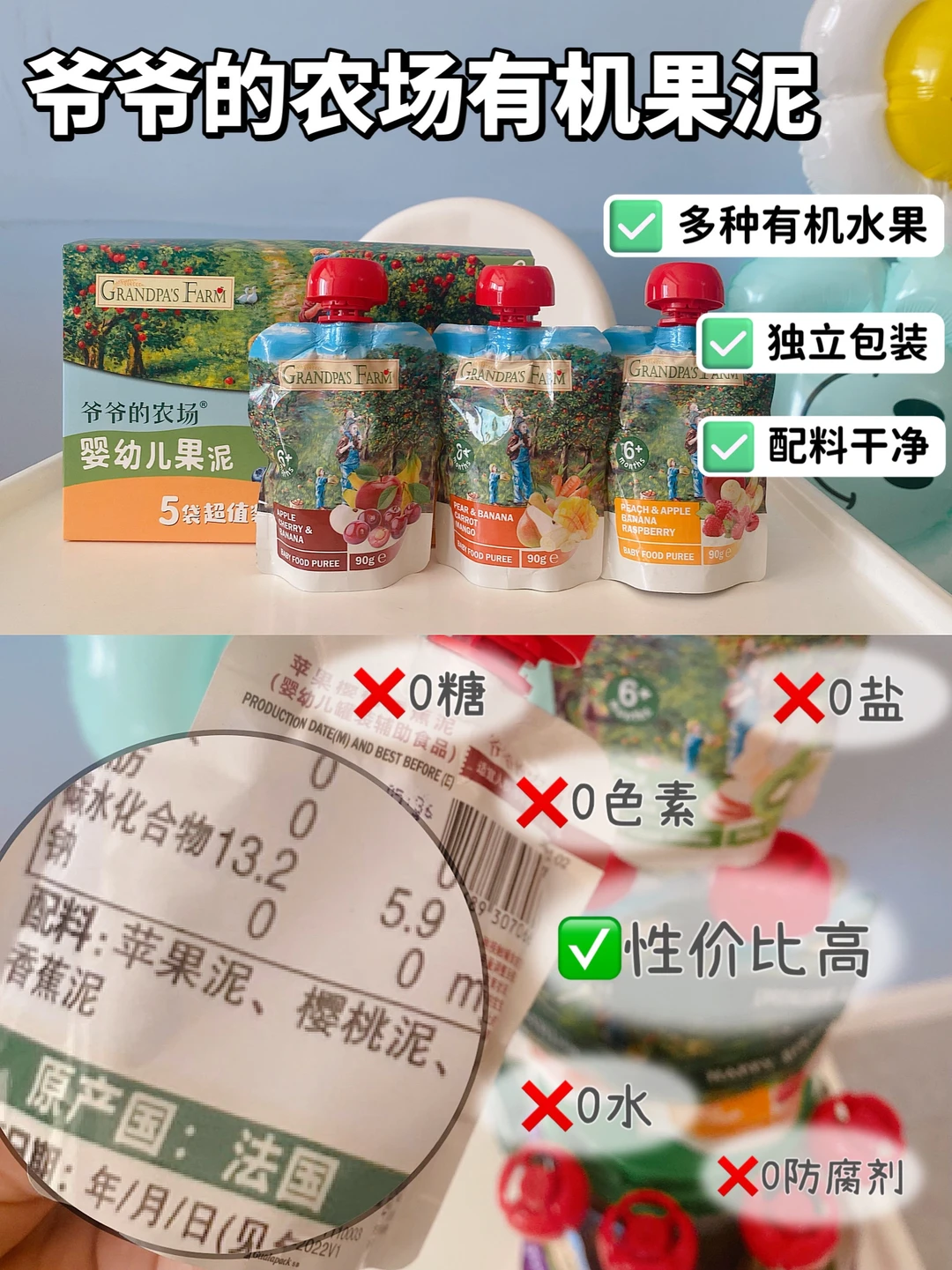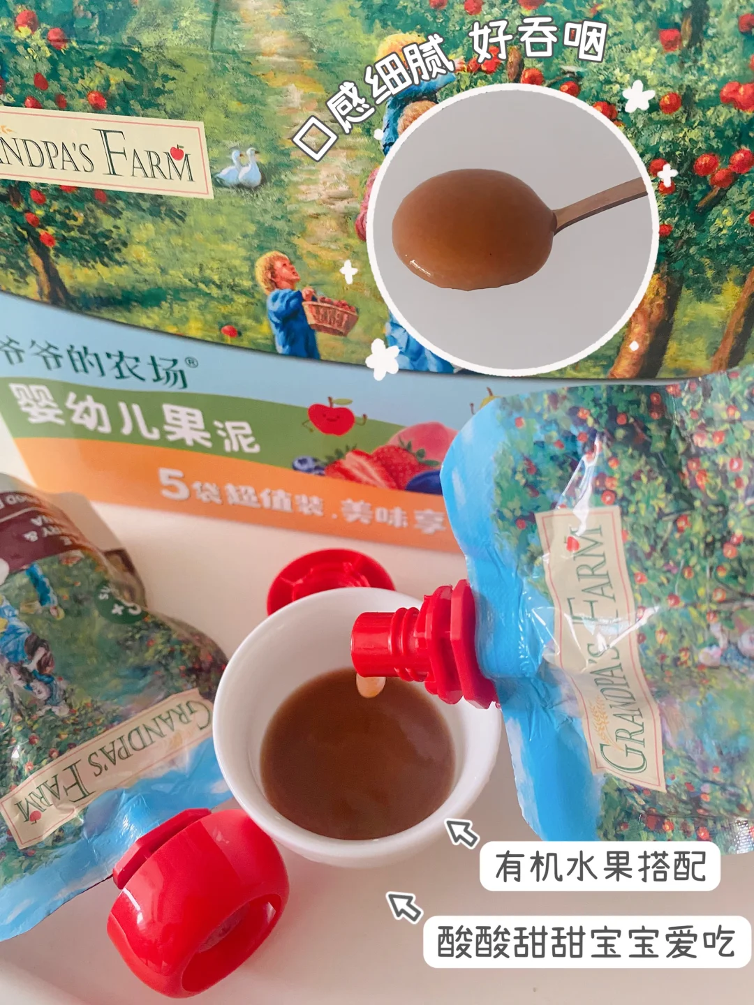 ✨初添加时我给宝宝选的是爷爷的农场有机果泥,多种有机水果搭配,不添加盐、糖、色素、水、浓缩柠檬汁、防腐剂等,90克一袋独立包装,挤到勺子🥄里喂食很方便,性价比很高,外出携带小小一包也不占地方。这个果泥细腻好吞咽😋,酸酸甜甜的,宝宝👧🏻很喜欢吃。