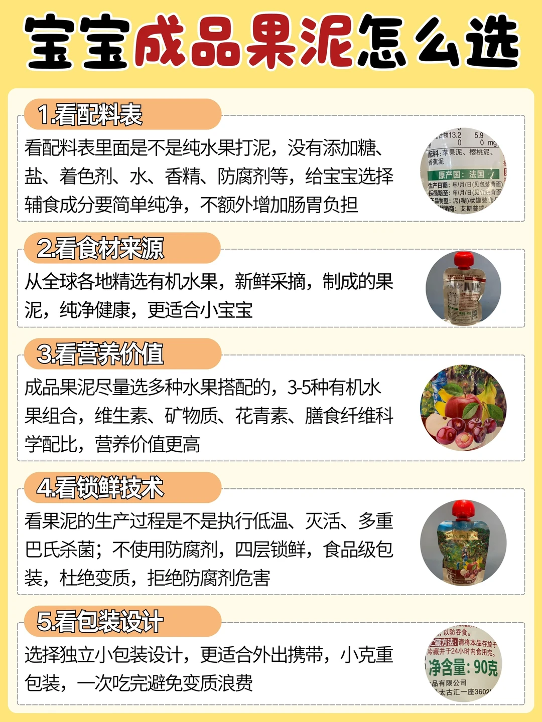 ✨那我自己在挑选成品果泥上有几点比较看重,优先选有机的果泥,妈妈们经常买菜都知道有机的果蔬比起非有机的价格会比较贵,而且品质也更好,那在果泥上价格差不多的话当然选有机的,其次符合标准,小月龄吃的果泥符合婴标GB10770,大月龄吃的符合国标就行;还有看配料表,避开添加糖、盐、果汁果浆等,还要注意过敏源