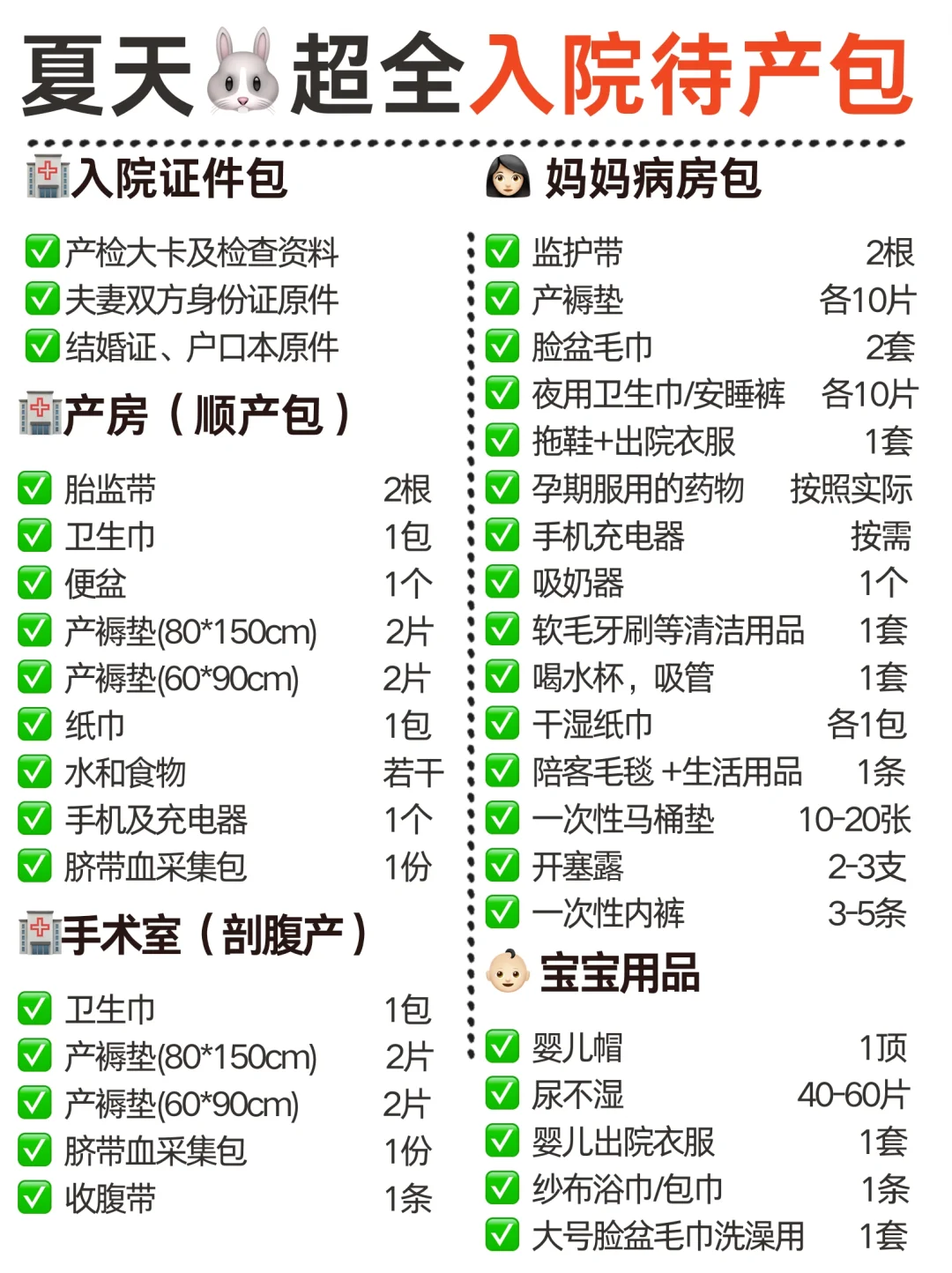 不懂就问有问必答 36周二胎🐰妈待产包清单改了八百遍终于改好了,趁着这几天618囤货收尾,装好箱就可以随时准备出发了! · 夏天预产期,所以待产物品准备是基于夏天的,6-10月都可以参考,虽然夏天开空调,但是还是会很热,厚的衣服包被就不需要了! · 住院产房包看图3,同时也要了解生产🏥的要求,不要多带也不要遗漏! · 祝愿姐妹们待产顺利!生产顺利!育儿顺利!