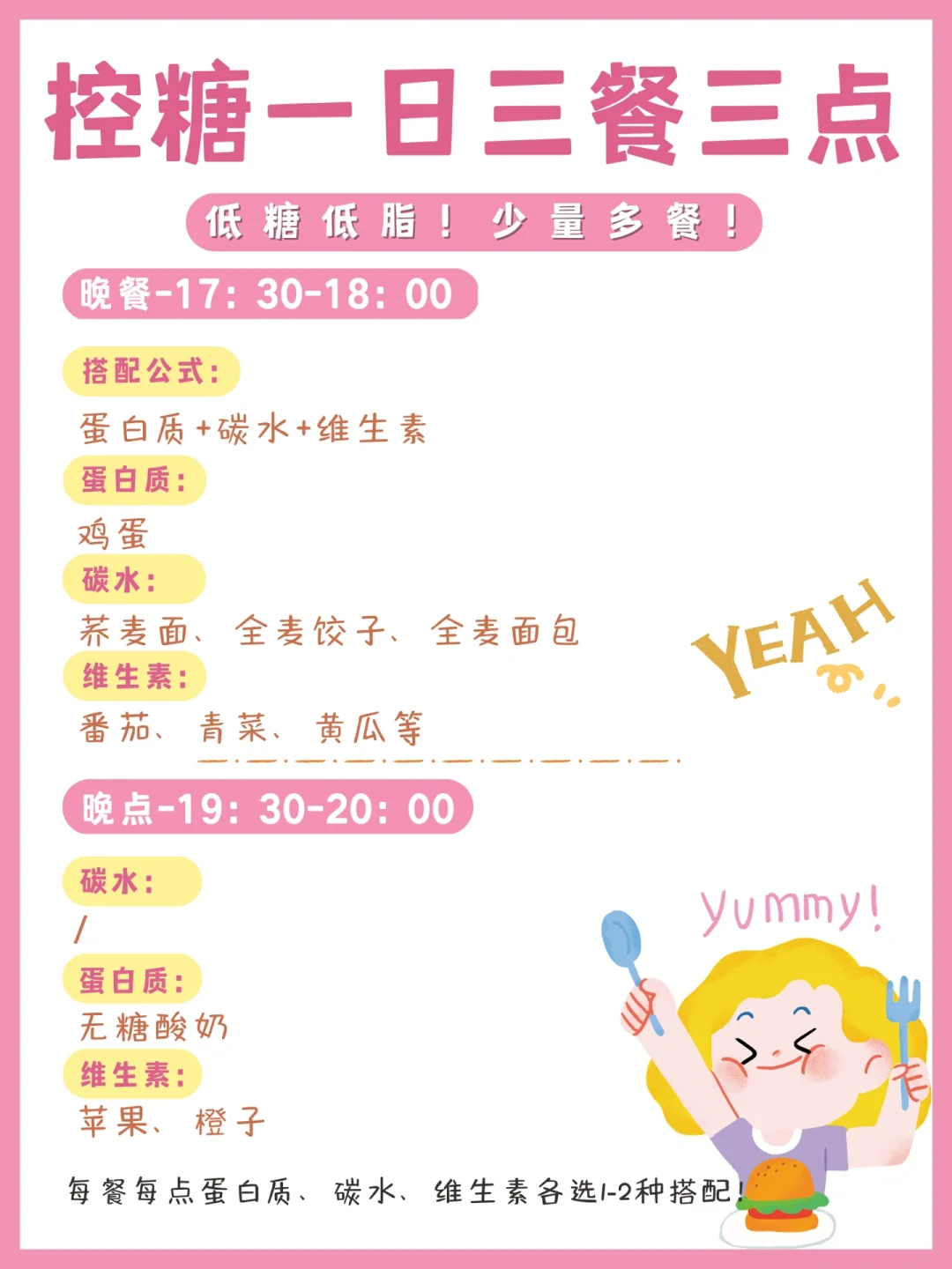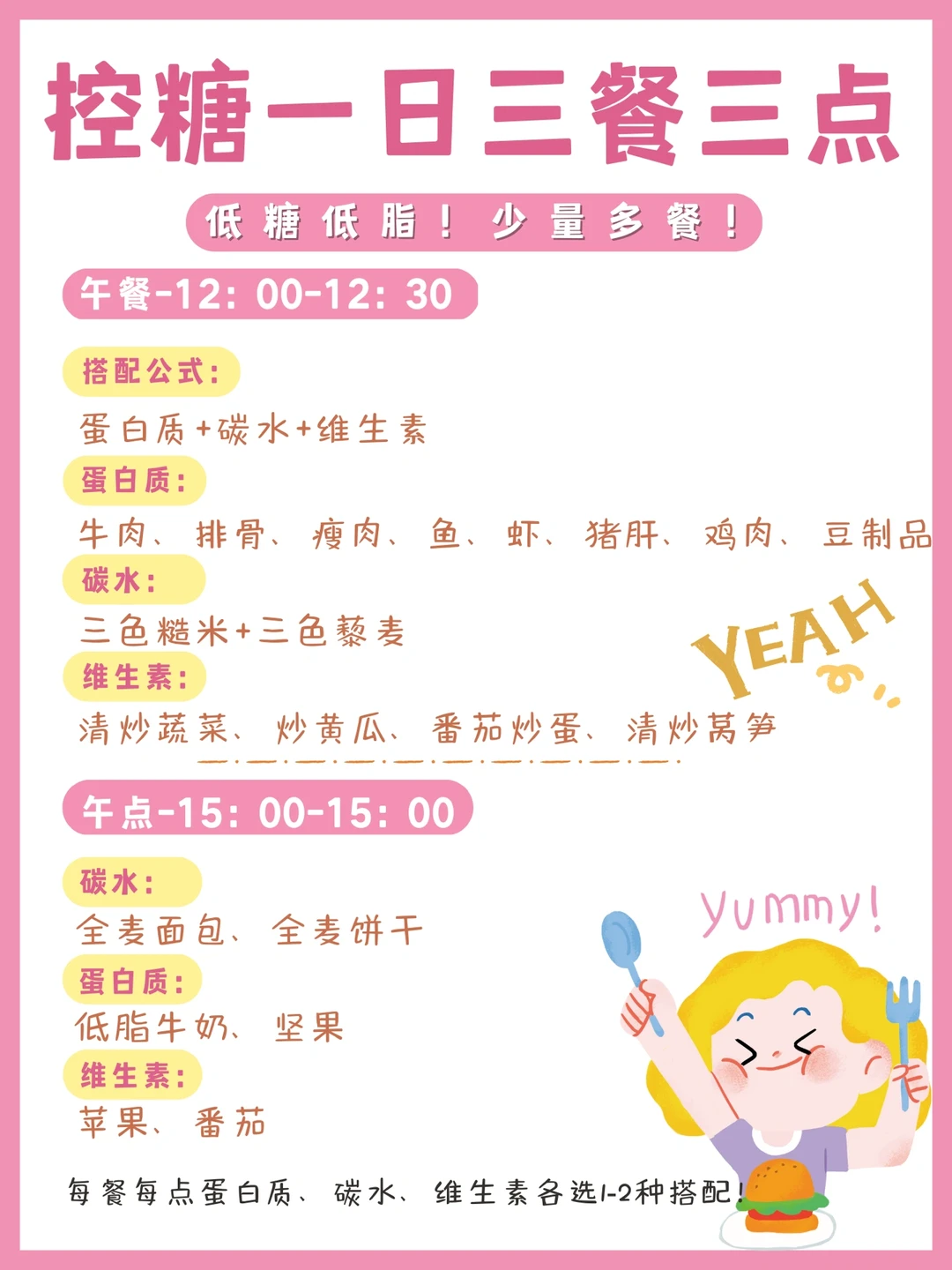 ✅⑤三点(加餐)选择:(1-2个全麦饺子、一小块全麦面包、全麦饼干)(低脂高钙牛奶、无糖酸奶、坚果)(番茄、苹果)