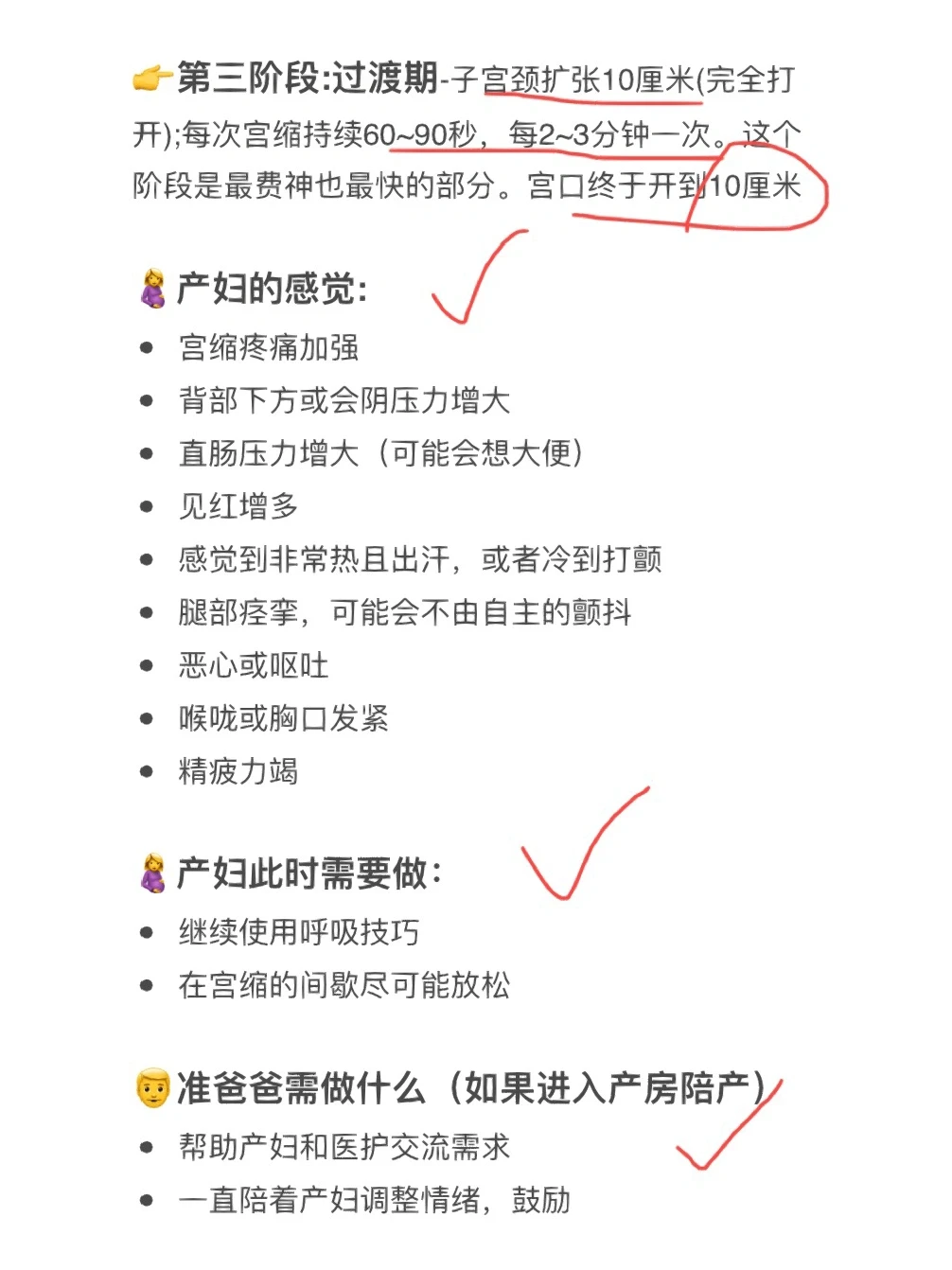 👉第三阶段:过渡期-子宫颈扩张10厘米(完全打开);每次宫缩持续60~90秒,每2~3分钟一次。这个阶段是最费神也最快的部分。宫口终于开到10厘米