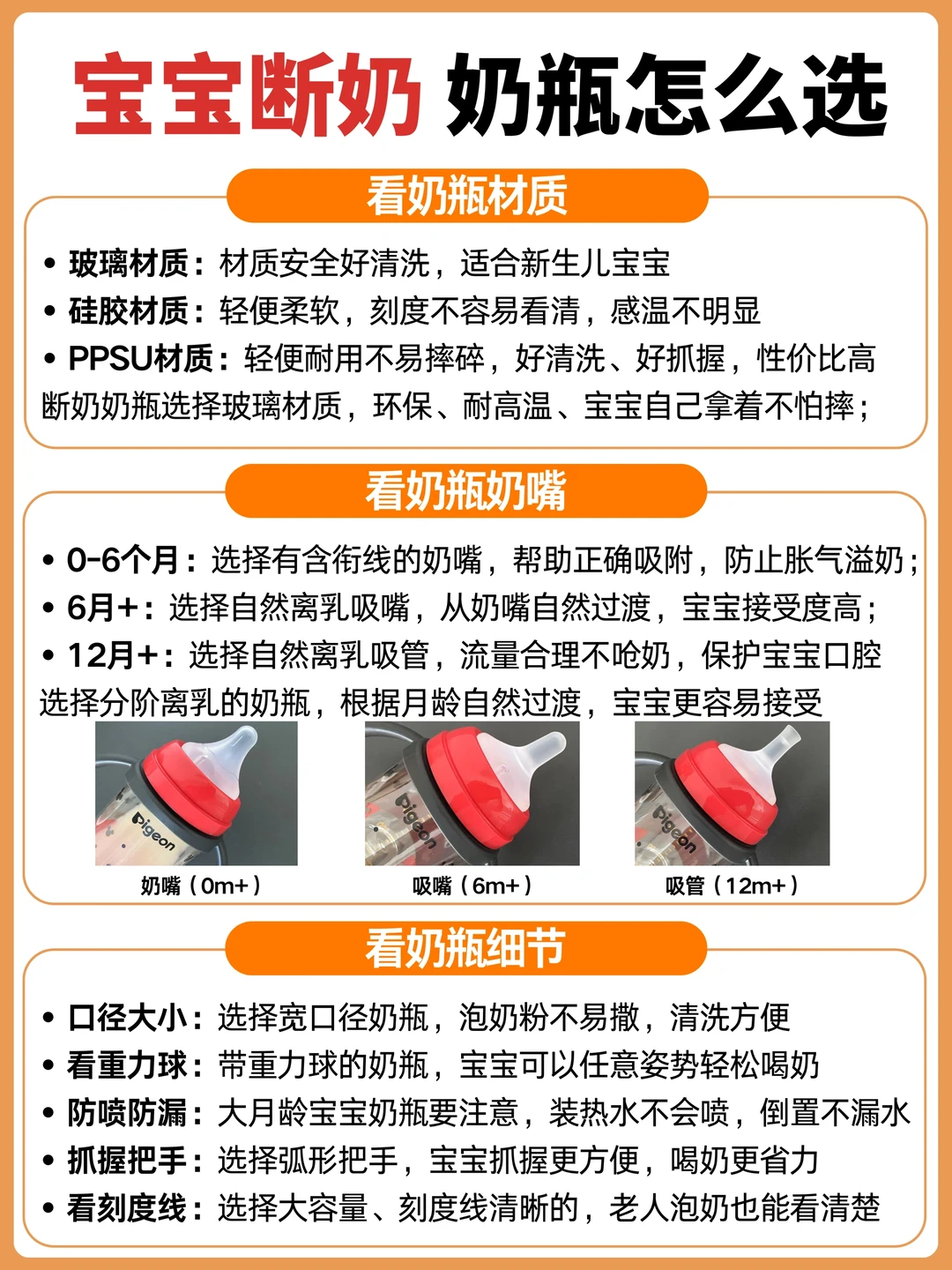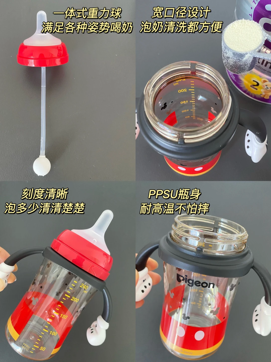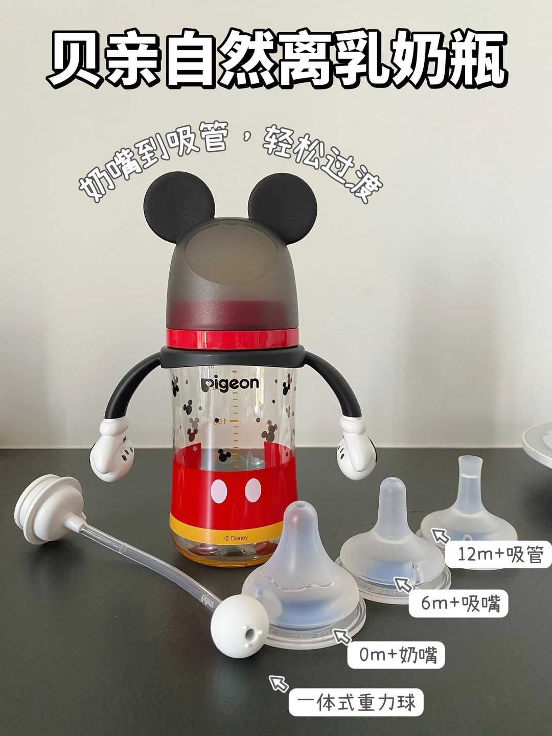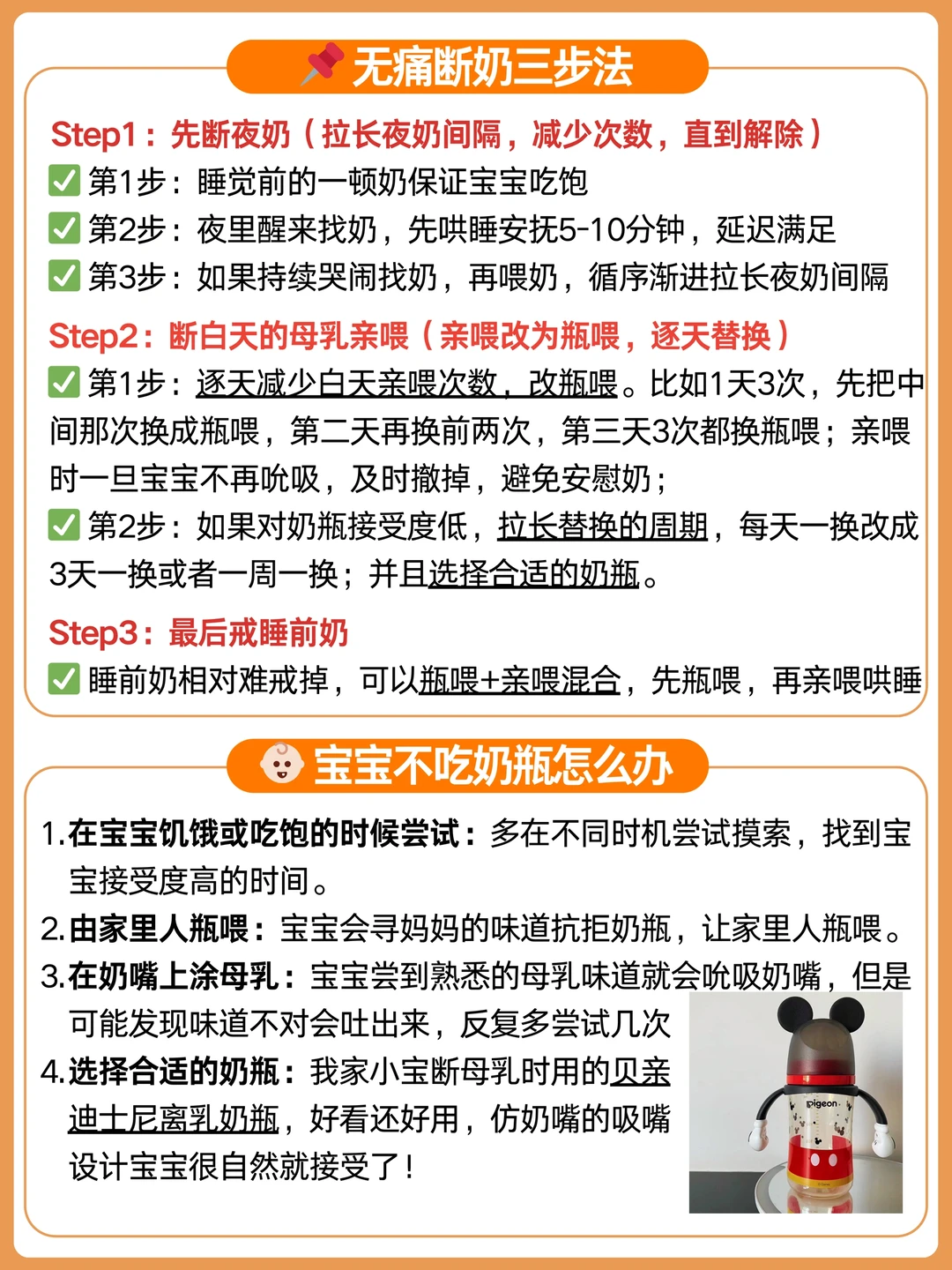 作为二胎妈妈,我真的是在育儿的各个环节都做足了功课,断奶也不例外。 计划断奶前至少2个月,我翻遍了段涛、陶思丰等大佬的,无一例外他们对断奶都是提倡“自然离乳”,简单总结就是: ❌ 拒绝分离式断奶、 拒绝断崖式断奶。 ✅ 倡导温和的自然离乳:宝宝和妈妈之间相互配合,都要做好心理和生理准备。职场妈妈如果要断奶,需要提前1个月左右开始循序渐进地进行,给自己和宝宝充足的时间适应。 · 在以上这些理论的指导和我的秘密武器—贝亲自然离乳奶瓶的帮助下,我只用了不到5天就断奶成功了!全程宝宝没有哭闹,也没有分离。我的经验分享给各位姐妹: 🌈 断奶时机、信号、准备工作(具体看P1) 🌈 断奶过程:先断夜奶→再断白天奶→最后断睡前奶(具体看P2) 🌈 断奶工具:吸奶器、背奶工具、奶粉、合适的奶瓶等 · 其中断奶很关键的一点是:宝宝要接受奶瓶。所以挑对奶瓶很重要,见过很多宝因为奶瓶不合适而拒绝喝奶的,真的很难断奶成功。 我家宝宝断奶使用的是贝亲自然离乳奶瓶。当初买它是冲着它的颜值,迪士尼联名款的米奇造型,真的超级可爱,宝宝也对它爱不释手!用过之后才知道它的设计细节更🐂。 可以一瓶多用,不换瓶身,就能搭配不同的奶嘴、吸嘴、吸管,实现分阶过渡,自然离乳,满足宝宝不同阶段的喂养需求,让喂养变得超省心。 · 0-6月龄,是柔软Q弹的食品级硅胶材质奶嘴,还设计了含衔线,不呛奶很适合新生儿 6月龄+,过渡到了圆头仿奶嘴设计的吸嘴,Y字型设计,流速、流量刚刚好匹配这个阶段的宝宝,不喷奶不呛奶,我家宝宝很顺利就接受了。 到了12月龄+, 可以直接换成自带十字隔膜的吸管,随着宝宝吸咬调整流速,平滑出水,不呛奶不漏奶,咕嘟咕嘟大口喝。装热水不会喷出来,倒置也不漏水,配合重力球躺坐都能喝。 · 纠结宝宝离乳奶瓶怎么选的妈妈,可以盲选这款,一步到位,省💰省👶🏻还不费妈!