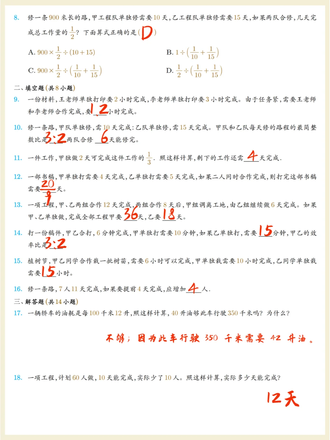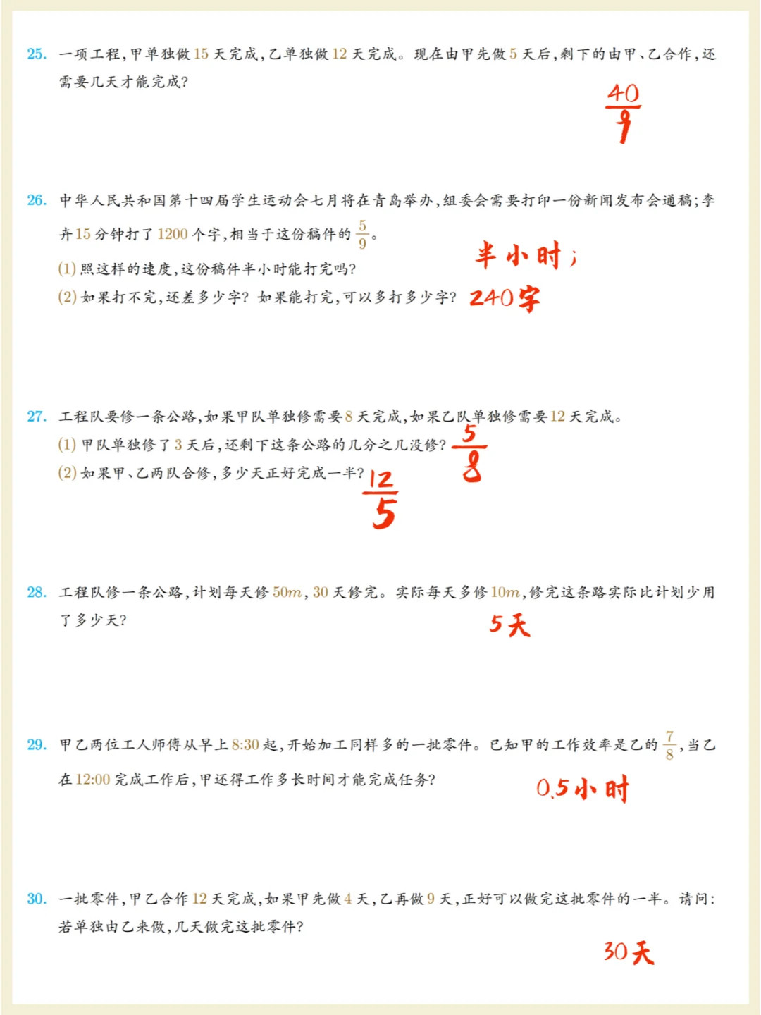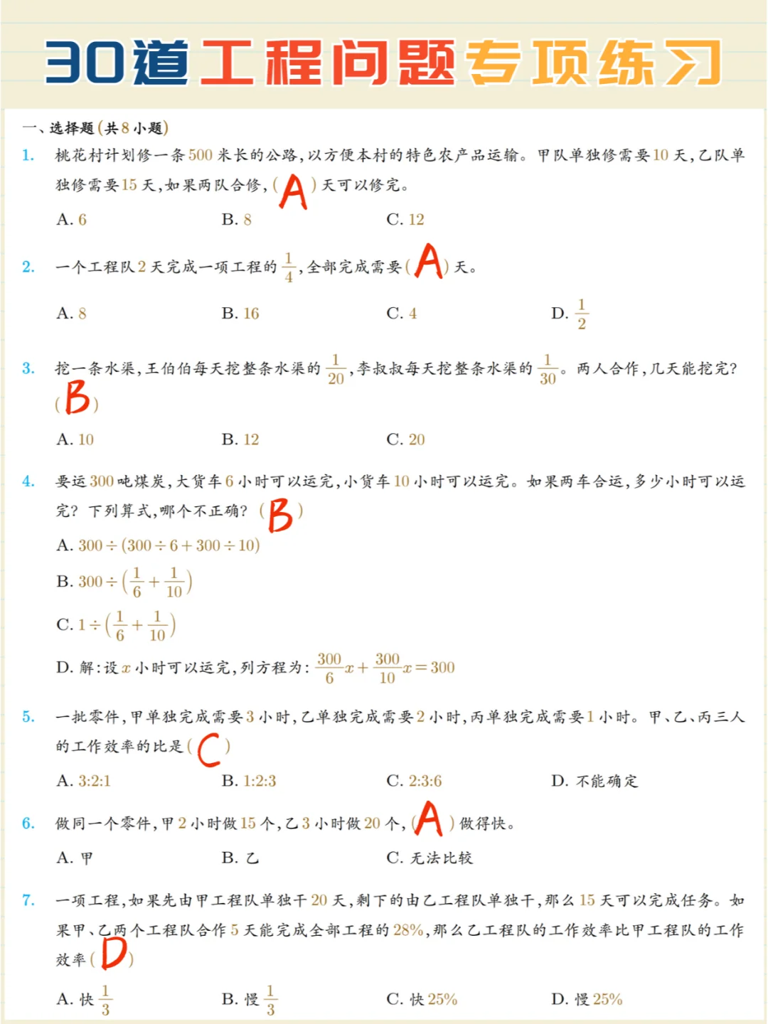👉在工程问题中,一般要出现三个量:工作总量、工作时间(完成工作总量所需的时间)和工作效率(单位时间内完成的工作量)。 🌈【基本公式】 这三个量之间有下述一些关系式: 工作效率×工作时间=工作总量 工作总量÷工作效率=工作时间 工作总量÷工作时间=工作效率 🌈【规律总结】不要求记忆,但要求能够理解和运用: 1️⃣工作效率提高了 a%,工作总量不变的前提下,工作时间则变为原来的 100/(100+a)。时间缩短了 a/(100+a)。 2️⃣工作效率降低了 a%,工作总量不变的前提下,工作时间则变为原来的 100/(100-a),时间延长了a/(100-a)。 3️⃣工作效率提高了 a/b,工作总量不变的前提下,工作时间则变为原来的 a/(a+b),时间缩短b/ (a+b) 。 4️⃣工作效率降低了 a/b,工作总量不变的前提下,工作时间则变为原来的 b/(b-a),时间延长了a/(b-a) 。 5️⃣当出现甲工作了一段时间 a,乙工作了一段时间 b,则通常是把条件处理为甲乙合干了 a(或b 时间)后甲单干 (a-b) (或乙单干 (b-a)段时间)。