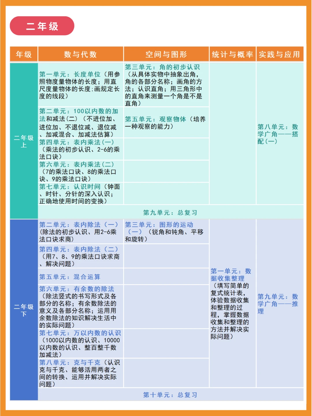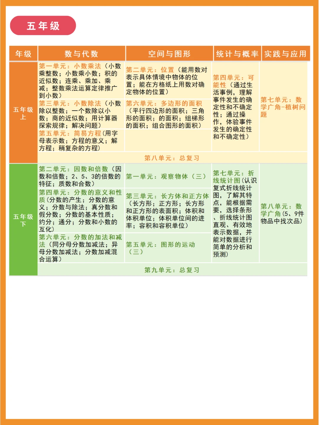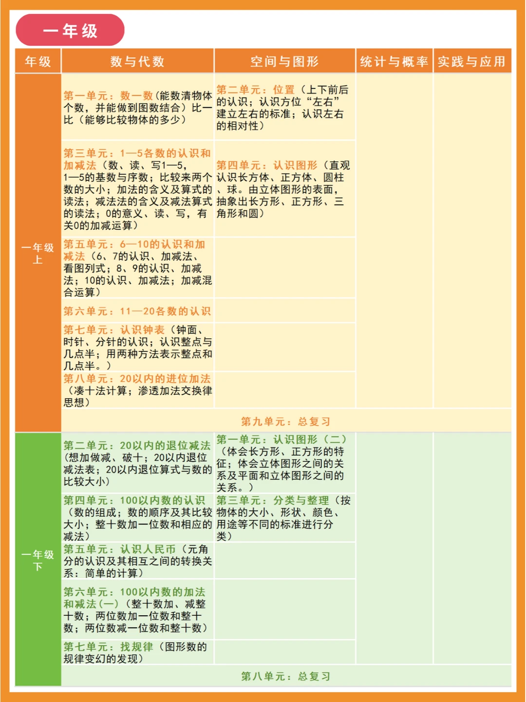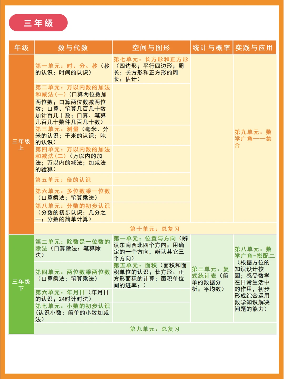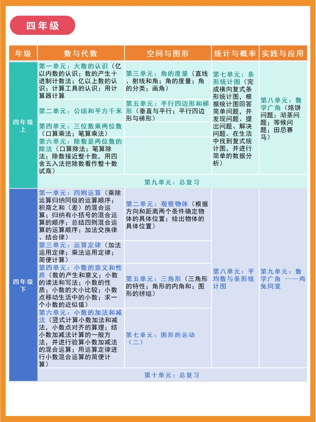 人教版小学数学知识点分布体系,建构各年级知识点联系! 🌈小学数学大致分为四部分:数与代数、空间与图形、统计与概率、实践与综合应用 🔴一、数与代数 是整个小学数学的主体部分,分为数的认识、数的运算、量的认识以及探索规律,前两者贯彻整个小学的始末,升入初中之后,就会变成数与式、方程与不等式、函数。 🔴二、空间与图形 分为图形的认识、测量计算、图形与变换、图形与位置 🔴三、统计与概率 主要是统计知识的初步学习,和可能性概括 🔴四、实践与综合应用 这部分以“数学广角”为主,主要向学生渗透一些重要的数学思想方法。 比如三年级上册的“集合”传达的是等量代换,四年级下册的鸡兔同笼问题要学习的是假设法这一解题方法。