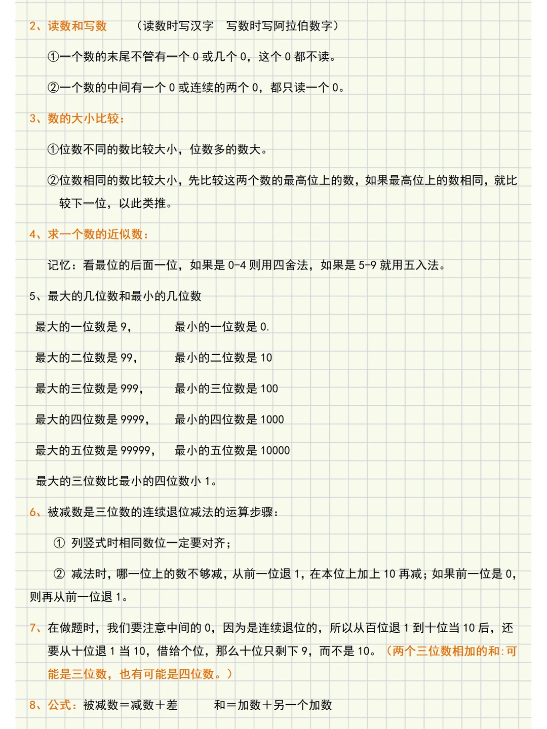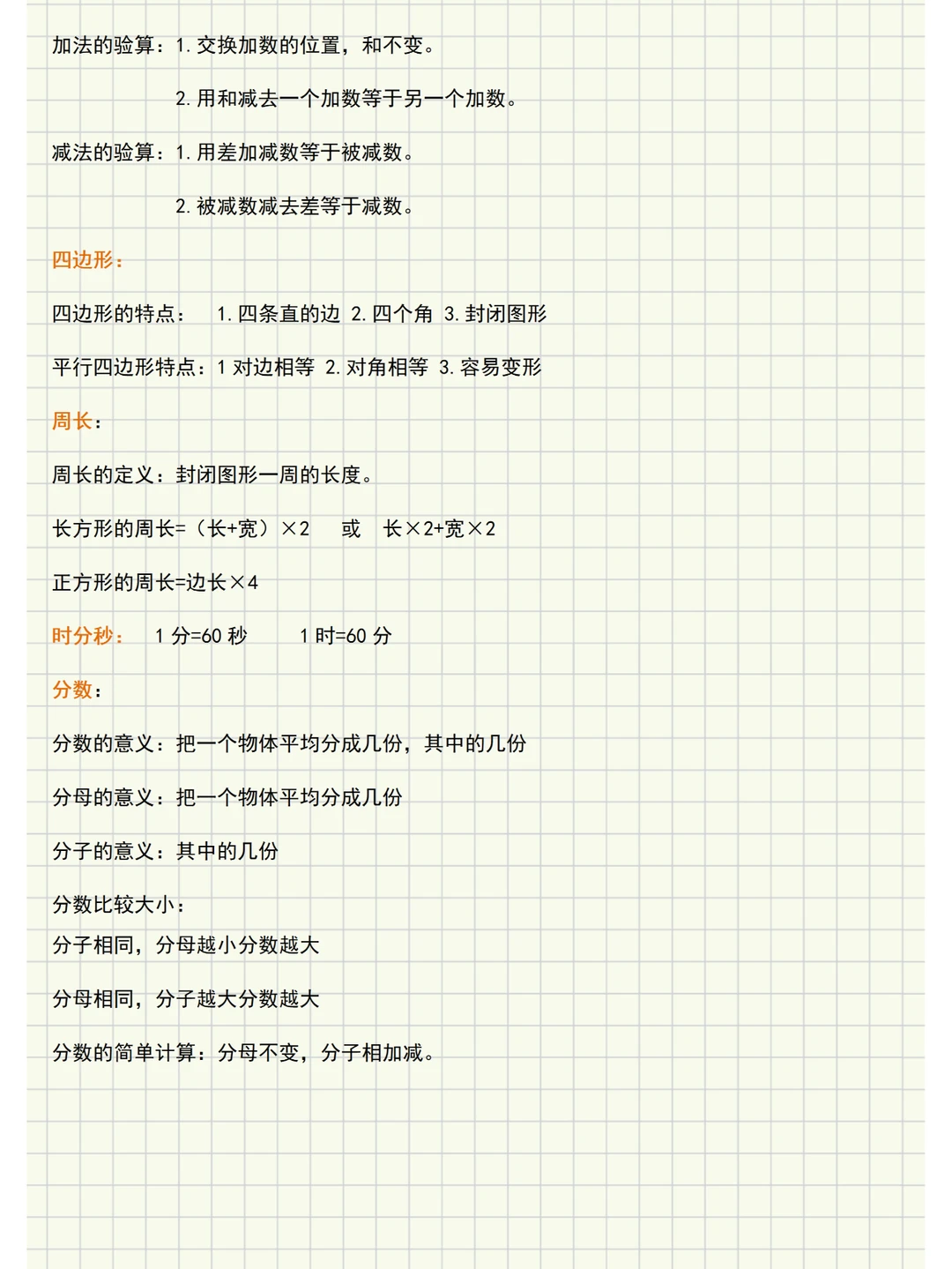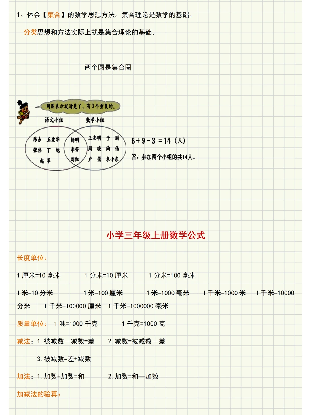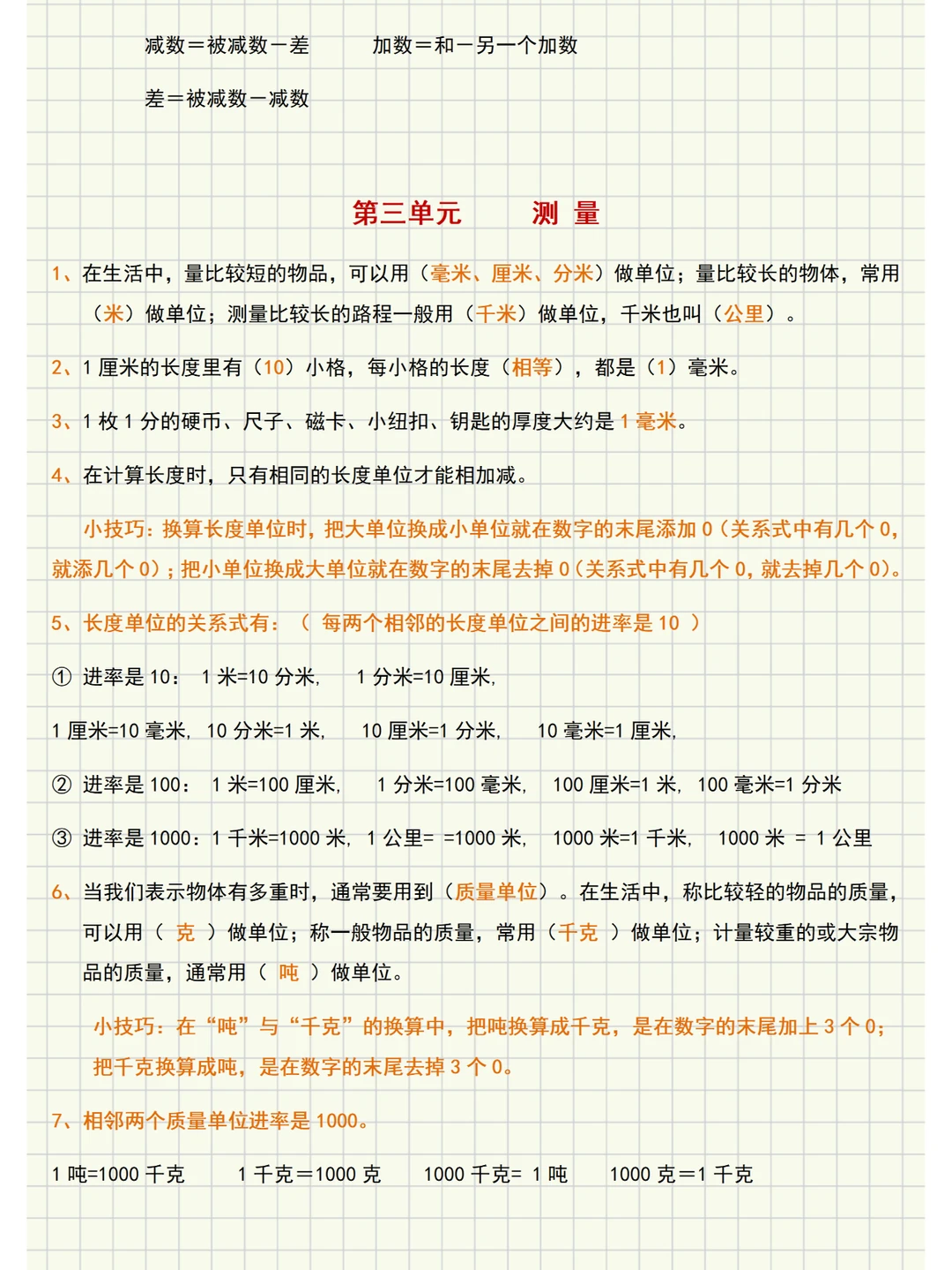 🌈人教版三年级数学上册知识点梳理,主要内容有: ✅第一单元《时、分、秒》:主要内容是秒的认识和时间的简单计算。 ✅第二单元《万以内的加法和减法(一)》:主要内容是两位数加、减两位数的口算以及笔算几百几十加、减几百几十和加、减法估算。 ✅第三单元《测量》:主要内容是毫米、分米、千米、吨的认识。这 ✅第四单元《万以内的加法和减法(二)》:主要学习三位数加、减三位数中连续进位加法和连续退位减法。 ✅第五单元《倍的认识》:倍的认识以及解决相关的简单实际问题。这些内容是在学生学习了表内乘法和表内除法,已理解乘、除法的意义的基础上进行学习的。 ✅第六单元《多位数乘一位数》:学习口算整十、整百数乘一位数和笔算乘法。 ✅第七单元《长方形和正方形》:学习四边形、周长、长方形和正方形的周长等内容。 ✅第八单元《分数的初步认识》:分数的初步认识和分数的简单计算及简单应用。 ✅第九单元《数学广角─集合》:体会集合思维方法,并用这种方法解决一些简单的实际问题。 🌈【重点】 1️⃣万以内数的加减法。 倍的认识。 2️⃣多位数乘一位数、笔算乘法。 长方形和正方形周长。 分数的认识。 🌈【难点】 1️⃣1毫米、1千米、1吨的表象建立以及建立时、分、秒的时间观念。 2️⃣万以内数加减法三位数加、减三位数中连续进位加和连续退位减,以及加、减法的估算。 3️⃣“倍”与乘、除法运算的关系以及能分析数量关系解决生活中的实际问题。 4️⃣提高多位数乘一位数的计算速度和正确率,进位叠加乘法。 5️⃣分数的意义以及整数减几分之几的分数减法。