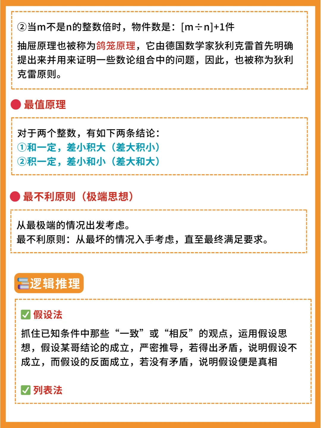 小学奥数组合板块体系包括数字谜、幻方、数表、逻辑推理、策略、容斥原理、抽屉原理、最值问题等多部分的内容。 ✨难度、年级跨度都很大,简单的数字谜、数阵图、幻方甚至逻辑推理和策略,年级较小的学生掌握起来也比较容易,但是随着年级提高难度上升比较快,所以这部分的选择要根据孩子的奥数基础情况来学。 👉这个板块有点类似数论,比较考验孩子数学思维能力,很吃天赋,虽然常规考试考察并不多,但是名校选拔和竞赛生考试的时候,比例往往占比较大,属于压轴题。