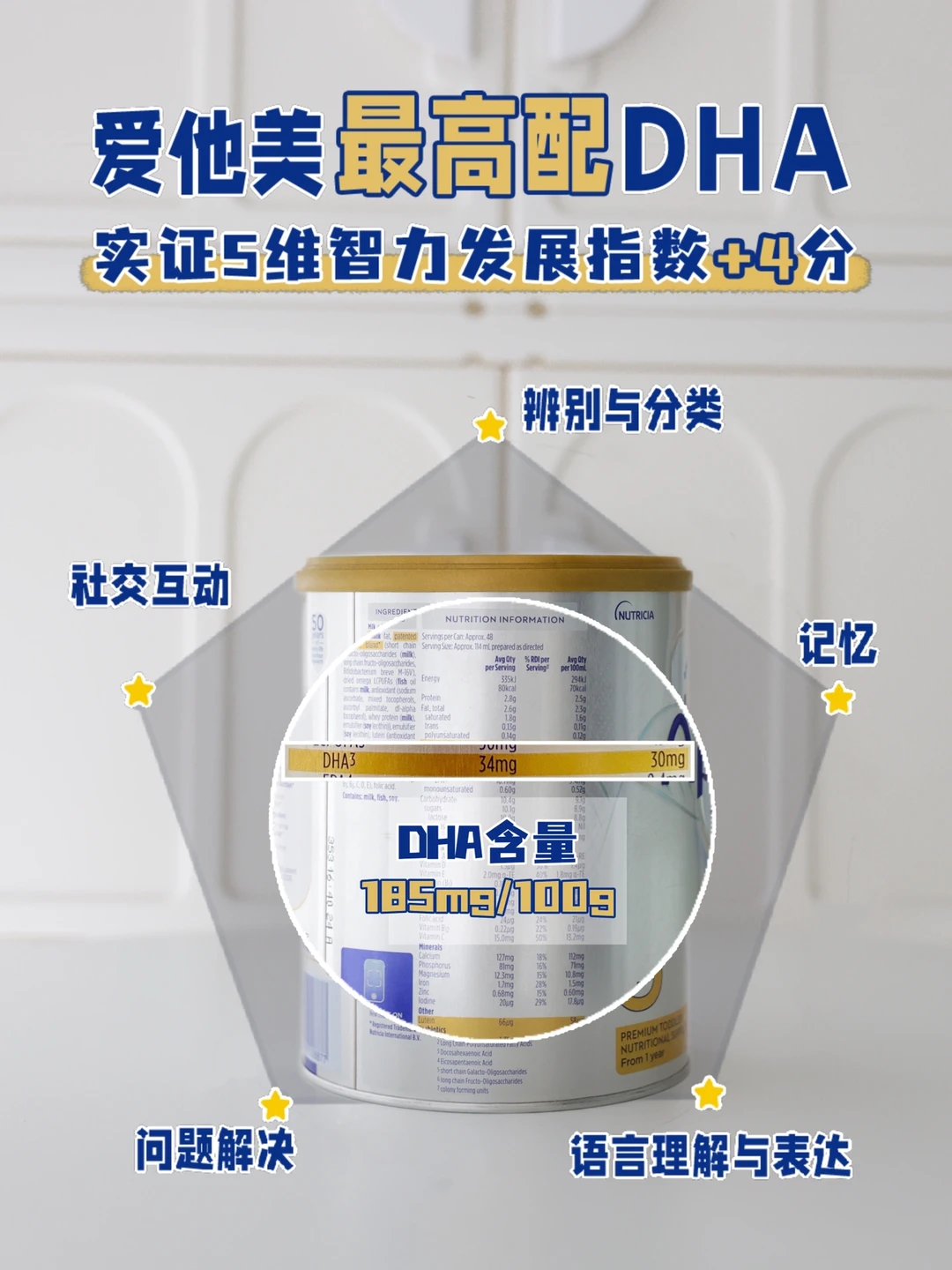✅认知力方面更是诚意满满,澳爱是爱他美系列里DHA含量添加最高的(185mg/100g),DHA补到位,能让宝宝五维智力发展综合指数+4分,黑白卡、听声辨位也能快速通过。还加了高配8倍叶黄素359μg/100g,正好满足关键期需求,高达90%防蓝光,不用为宝宝看屏幕而感到焦虑了