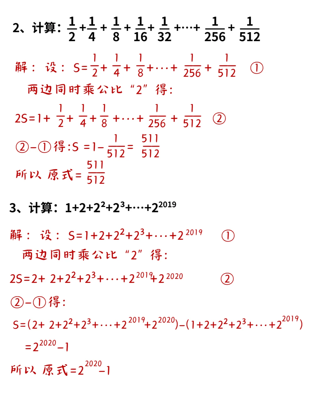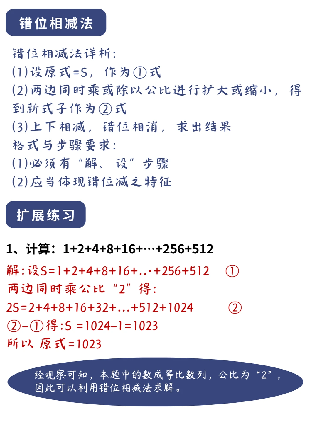 👨🏫昨天打卡视频中给大家讲解了例题,大家已经初步认识了错位相减法。虽然还只是简单的应用,但是在后续初高中的学习中,它将发挥重要的作用。💪💪💪 📌小升初考试中,错位相减法是种常见的解法,有时候会变换一种模式,但是思想不变。遇到一列数是等比关系,可以考虑试试错位相减法。 💥注意:相减抵消的时候要注意一个原则:大减小,负数要少。