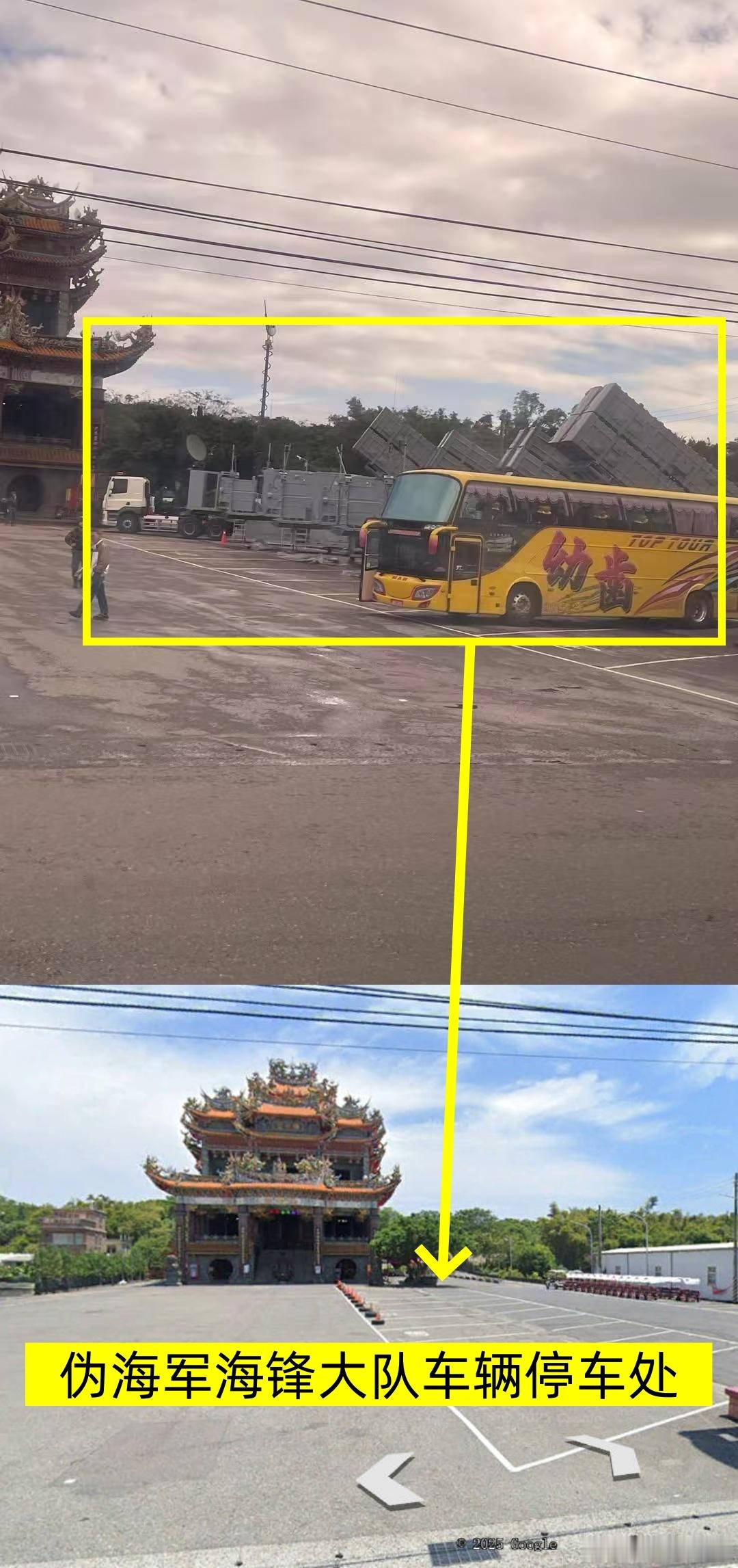 东部战区圆满完成正义使命演习正义使命2025演习画面 昨日,网络上出现了岛内民众拍摄的伪海军海锋大队的照片(图1、图2)。从图中可见,发射车的导弹发射筒已起竖,战术指管车辆的天线升起,有人持枪戒备;说明此时导弹处于待发状态,此地应为伪海军预设的一处机动发射阵地,值得重视。由于拍摄者未说明具体位置,给定位带来一定困难,根据图一判断可能位于一处宫庙内。经本人盯真,最终确定该地位置:台湾省宜兰县的过岭,大体位置(图3)。此处宫庙全名非常绕口:壮围过岭保安宫中坛元帅,(图4-图6)为该庙图片。具体坐标见(图7),地景对比见(图8),(图9)的航拍图可见宜兰外海的龟岛。台伪海锋大队的车辆就停放于宫庙的停车场内。