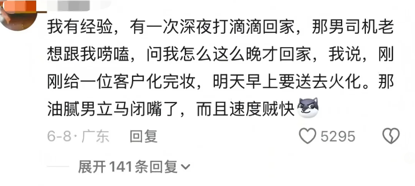 有一次深夜打滴滴回家,那男司机老想跟我唠嗑,问我怎么这么晚才回家,我说,刚刚给一位客户化完妆,明天早上要送去火化。那油腻男立马闭嘴了,而且速度贼快