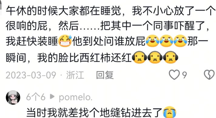 午休的时候大家都在睡觉,我不小心放了一很响的屁,然后......把其中一个同事吓醒了,我赶快装睡,他到处问谁放屁那一瞬间,我的脸比西红柿还红